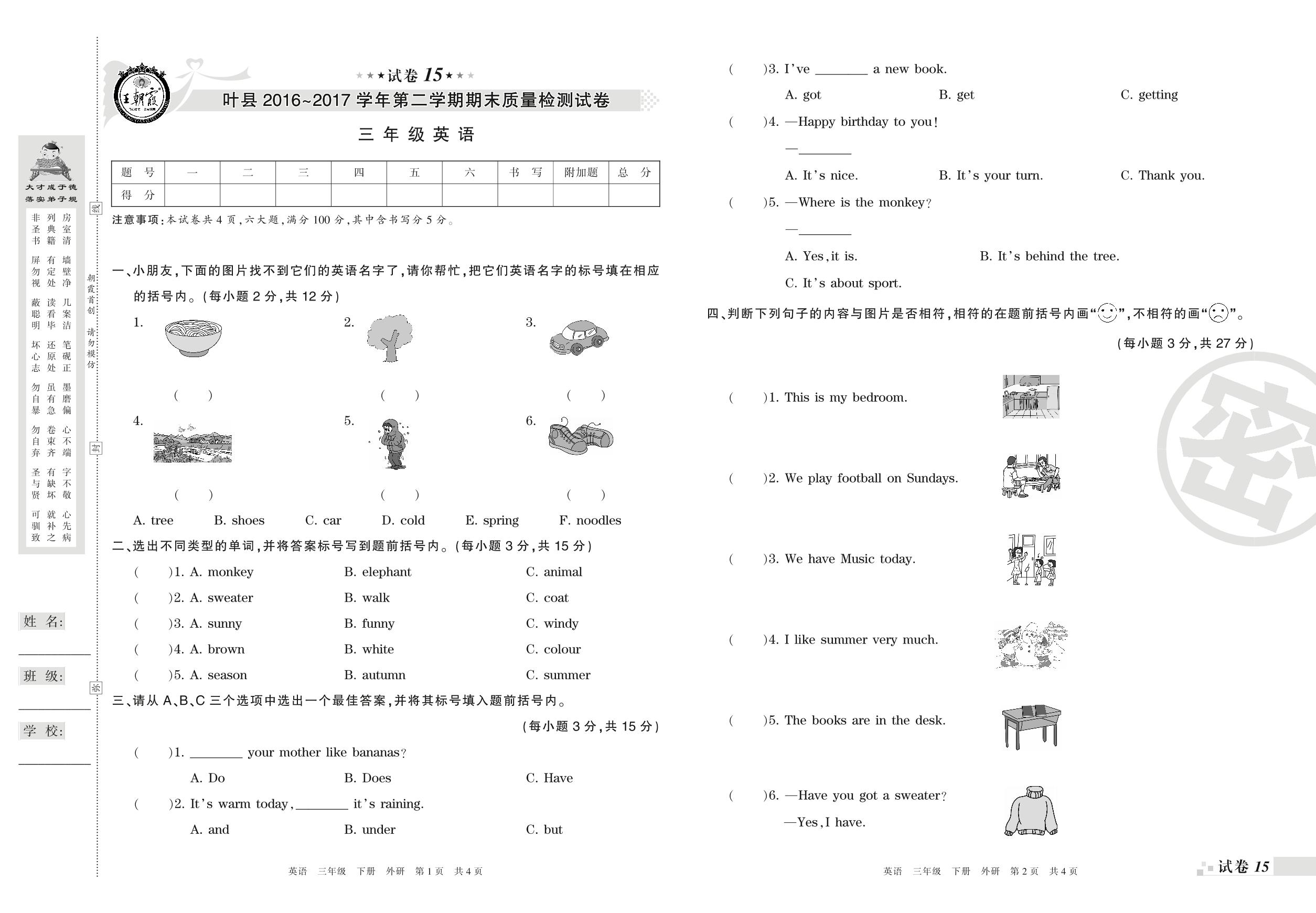 2016-2017学年第二学期平顶山市叶县三年级英语试卷(外研版)【15】