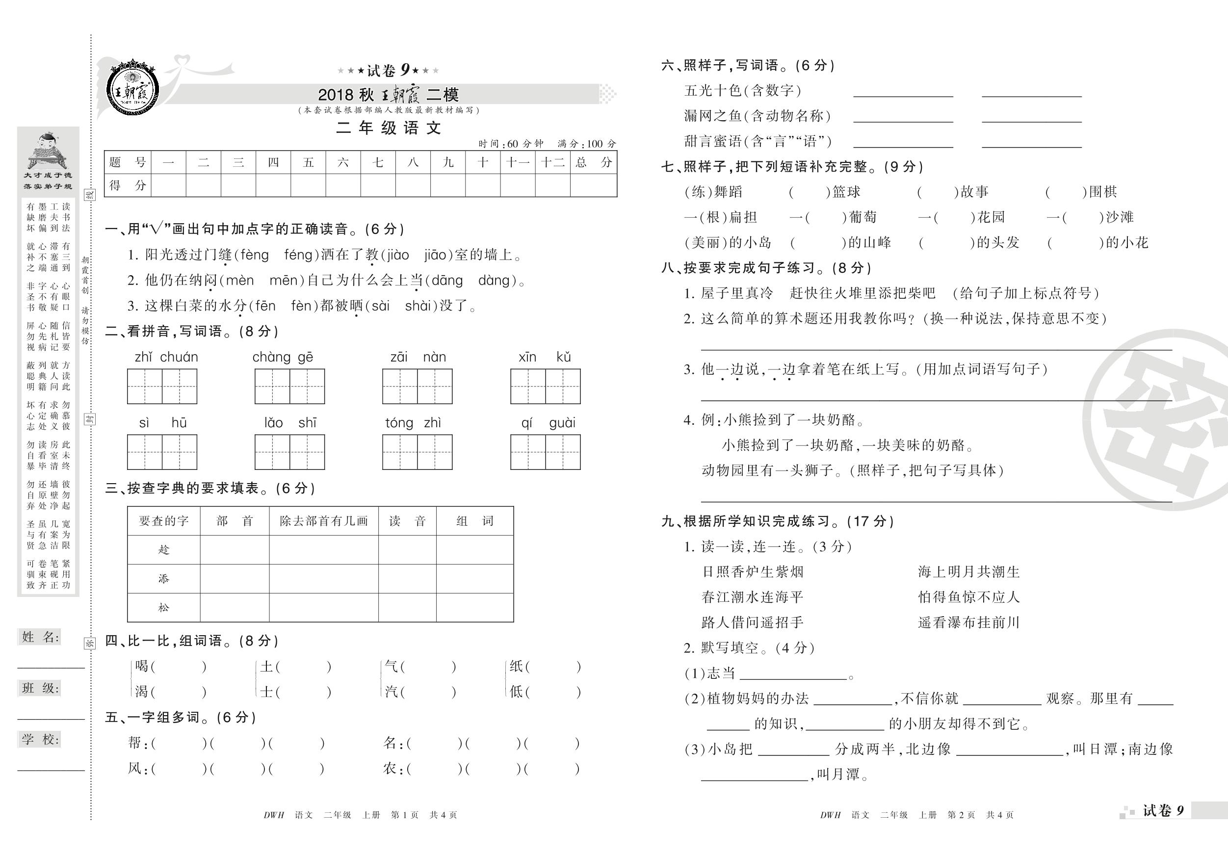 王朝霞期末模拟卷二年级上册语文(人教版)_R21080180932【9】