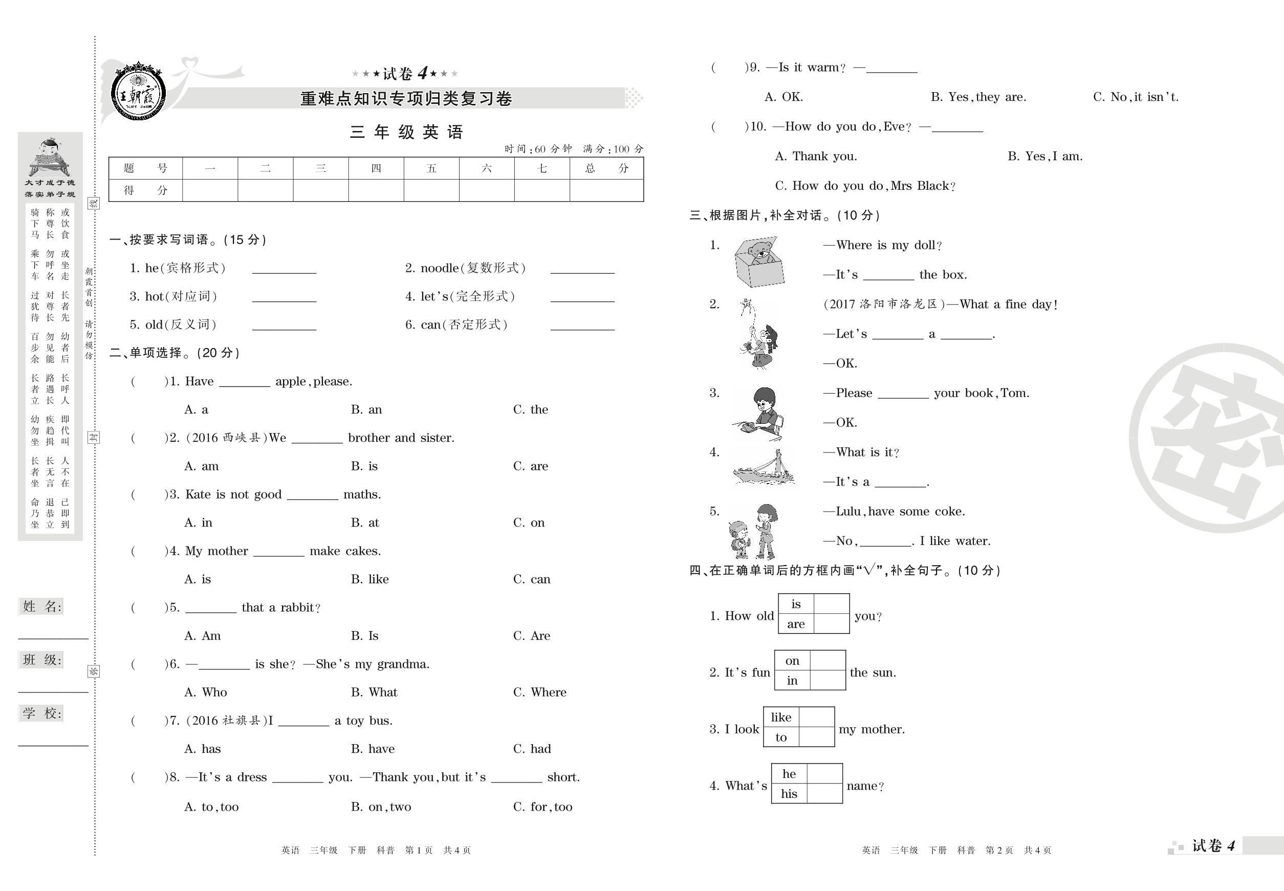 王朝霞期末专项卷——重难点知识专项归类复习卷三年级下册英语(科普版)【4】