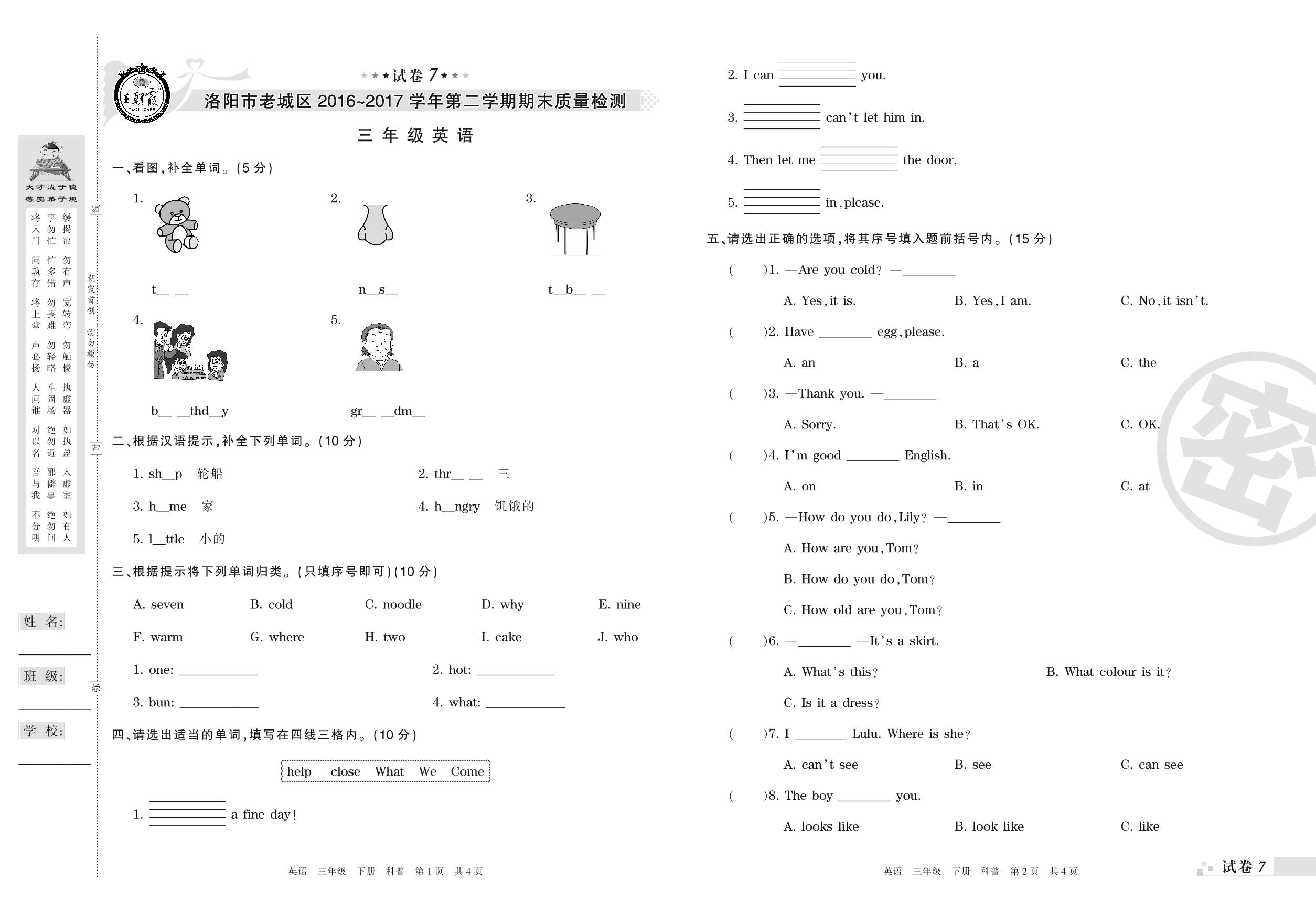 2016-2017学年第二学期洛阳市老城区三年级英语试卷(科普版)【7】