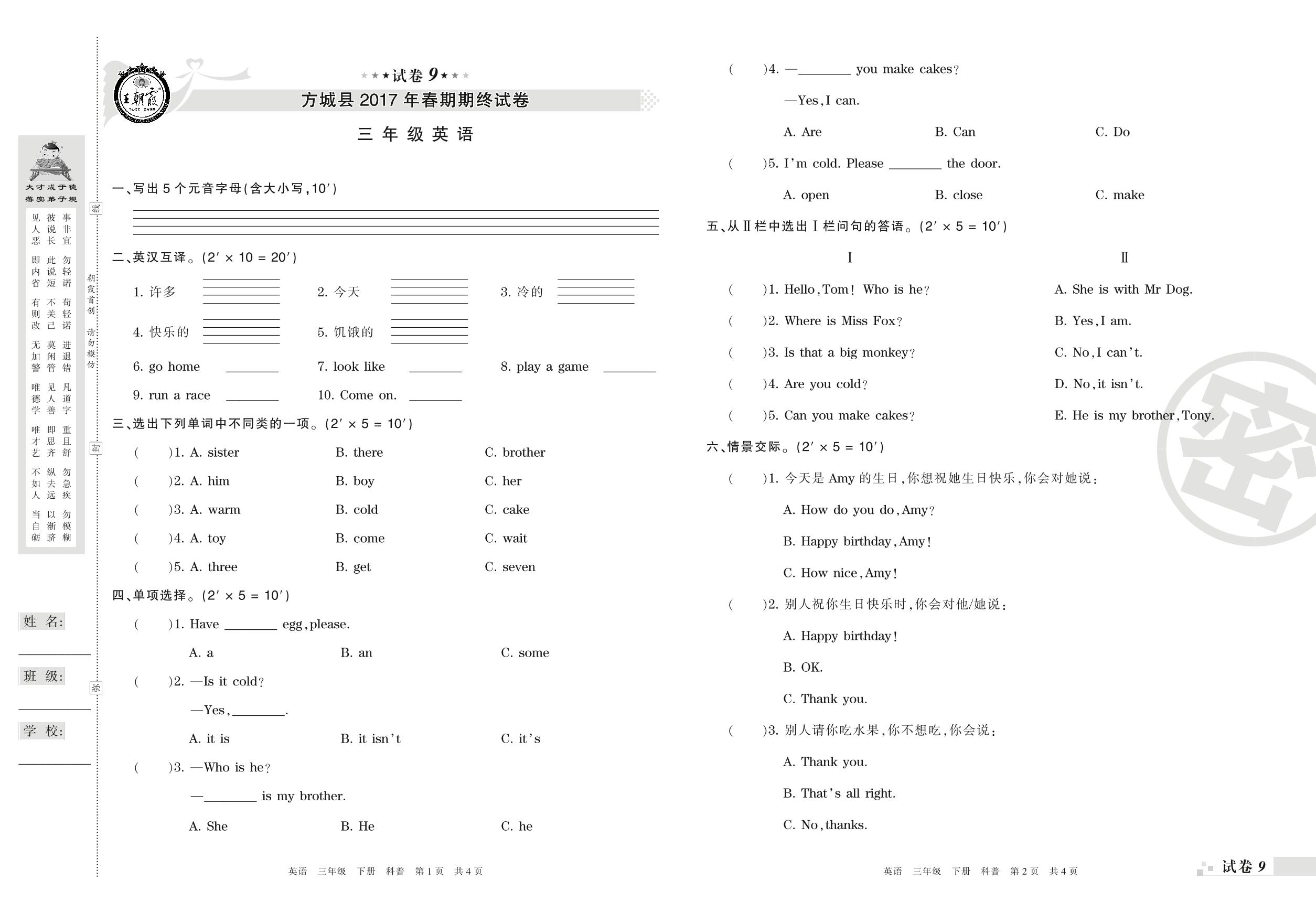 2016-2017学年第二学期南阳市方城县三年级英语试卷(科普版)【9】