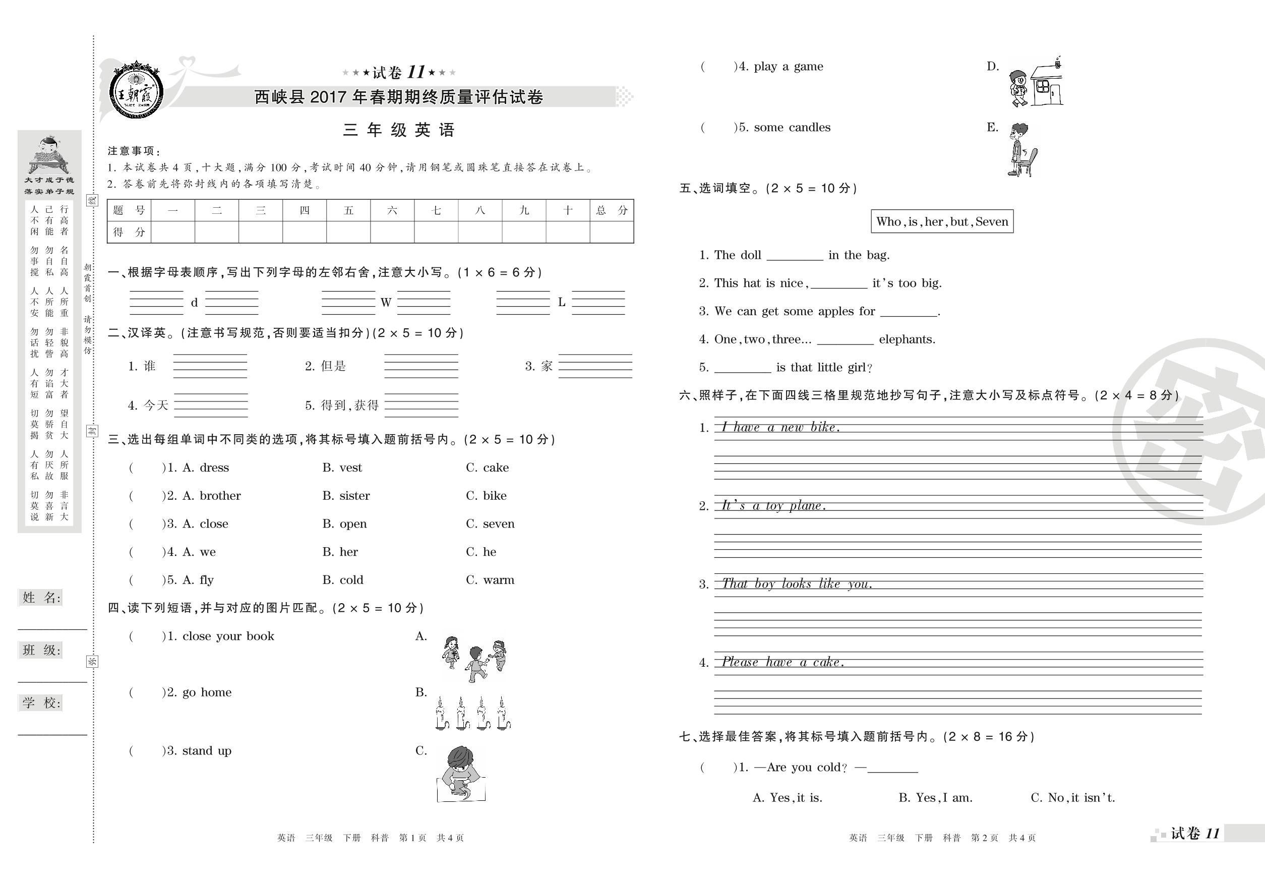 2016-2017学年第二学期南阳市西峡县三年级英语试卷(科普版)【11】