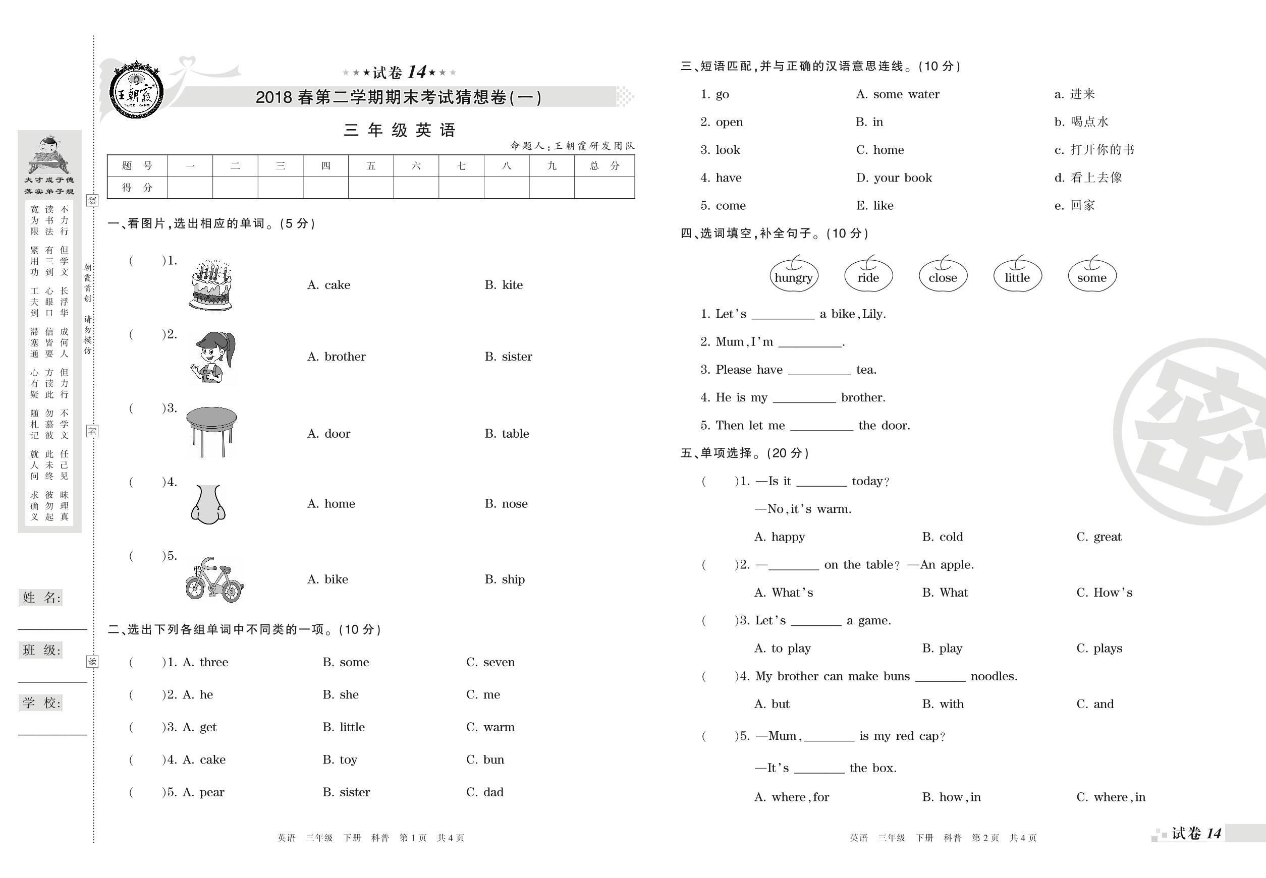 2017-2018学年第二学期期末考试猜想卷(一)三年级英语(科普版)【14】