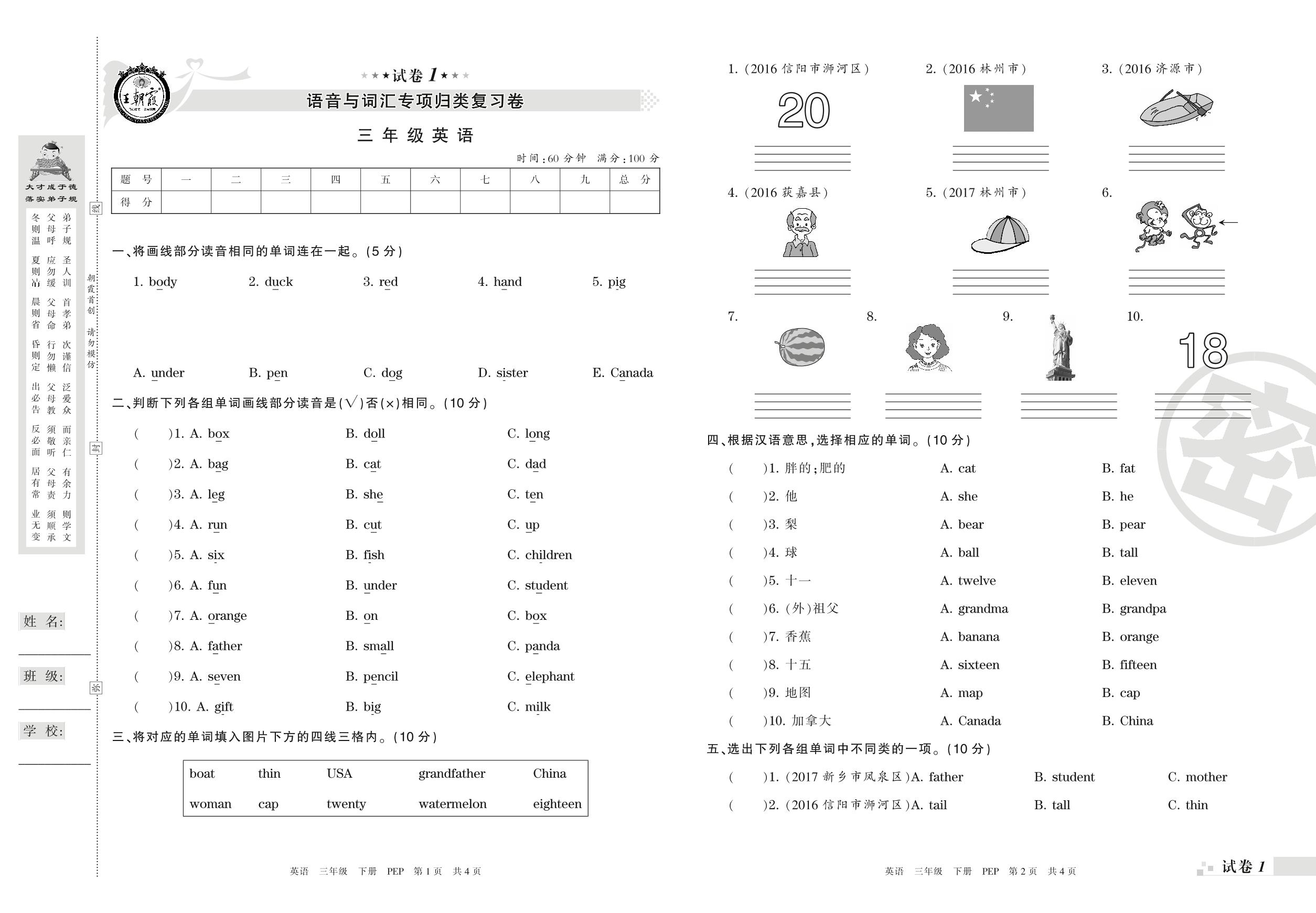 王朝霞期末专项卷——语音与词汇专项归类复习卷三年级下册英语(PEP版)【1】