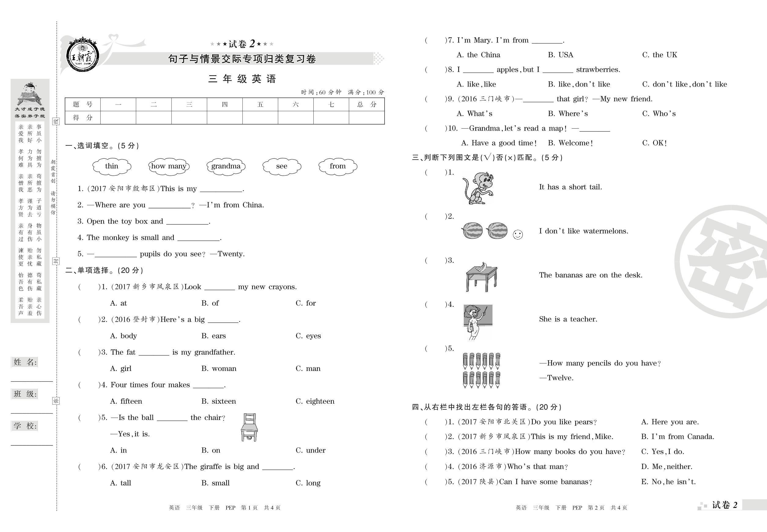 王朝霞期末专项卷——句子与情景交际专项归类复习卷三年级下册英语(PEP版)【2】