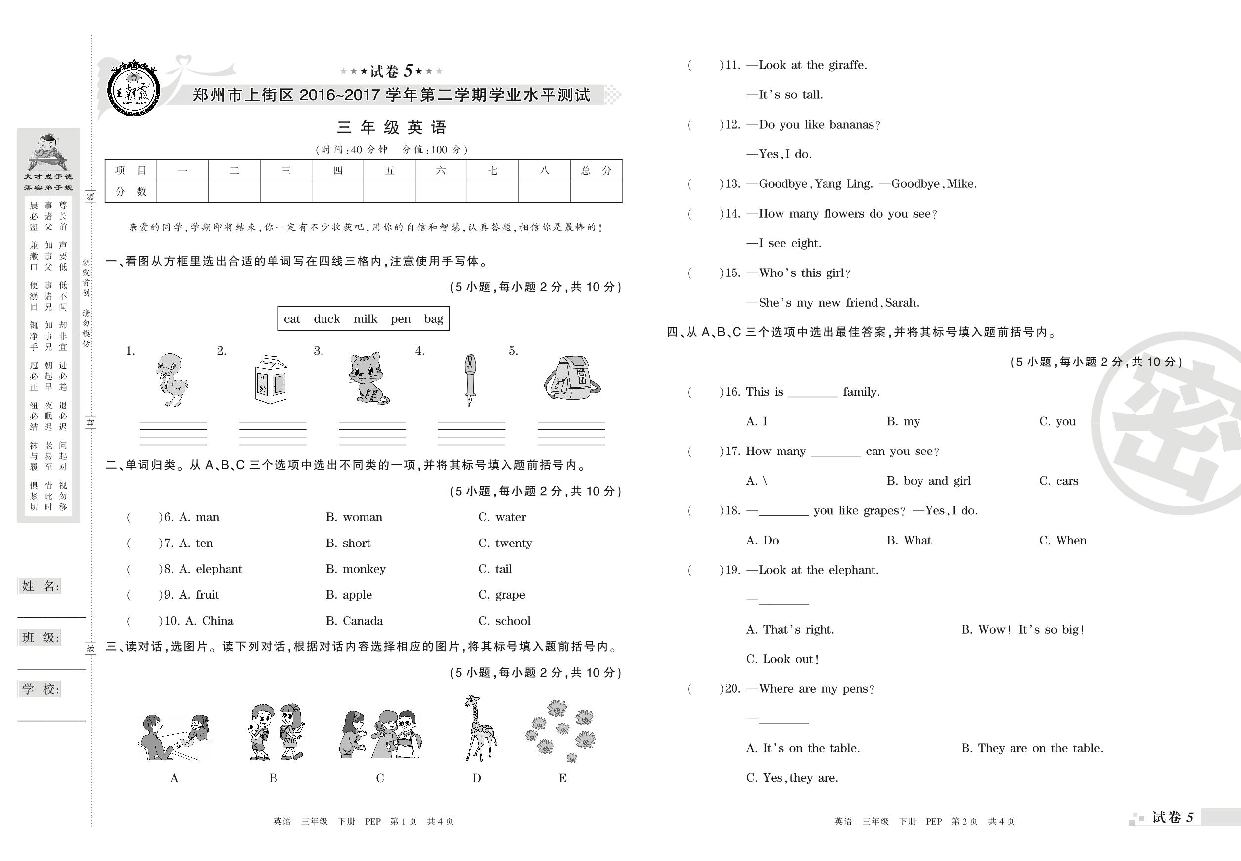 2016-2017学年第二学期郑州市上街区三年级英语试卷(PEP版)【5】