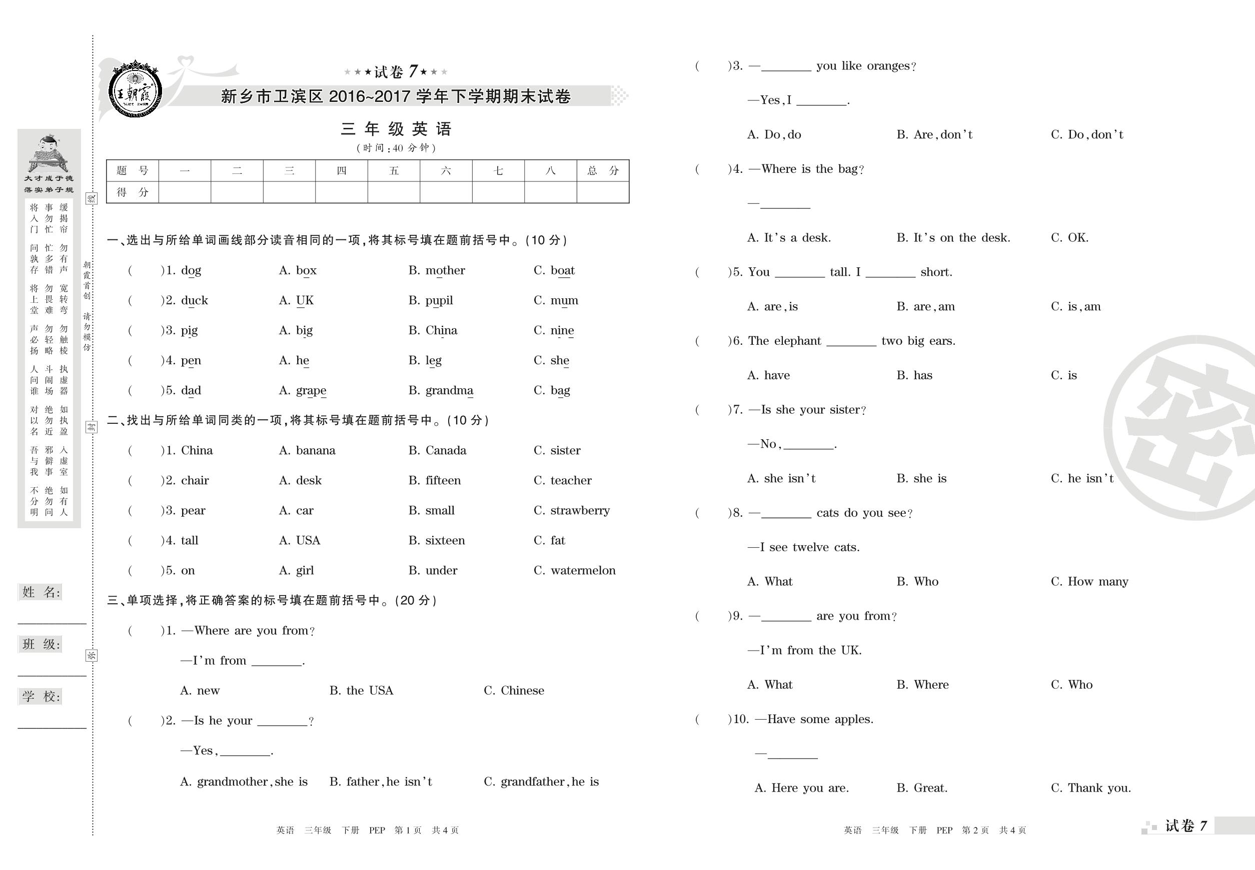 2016-2017学年第二学期新乡市卫滨区三年级英语试卷(PEP版)【7】