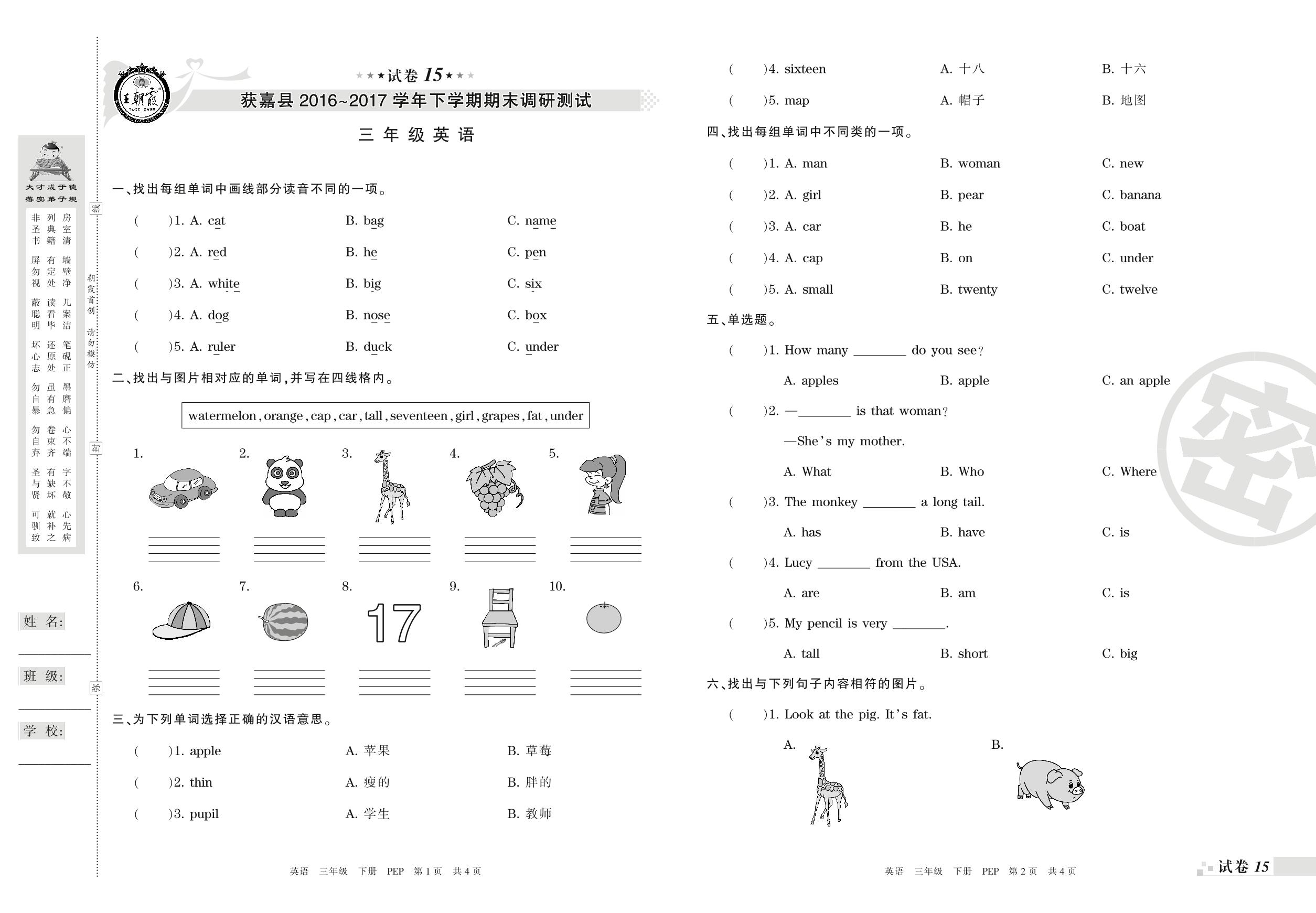 2016-2017学年第二学期新乡市获嘉县三年级英语试卷(PEP版)【15】