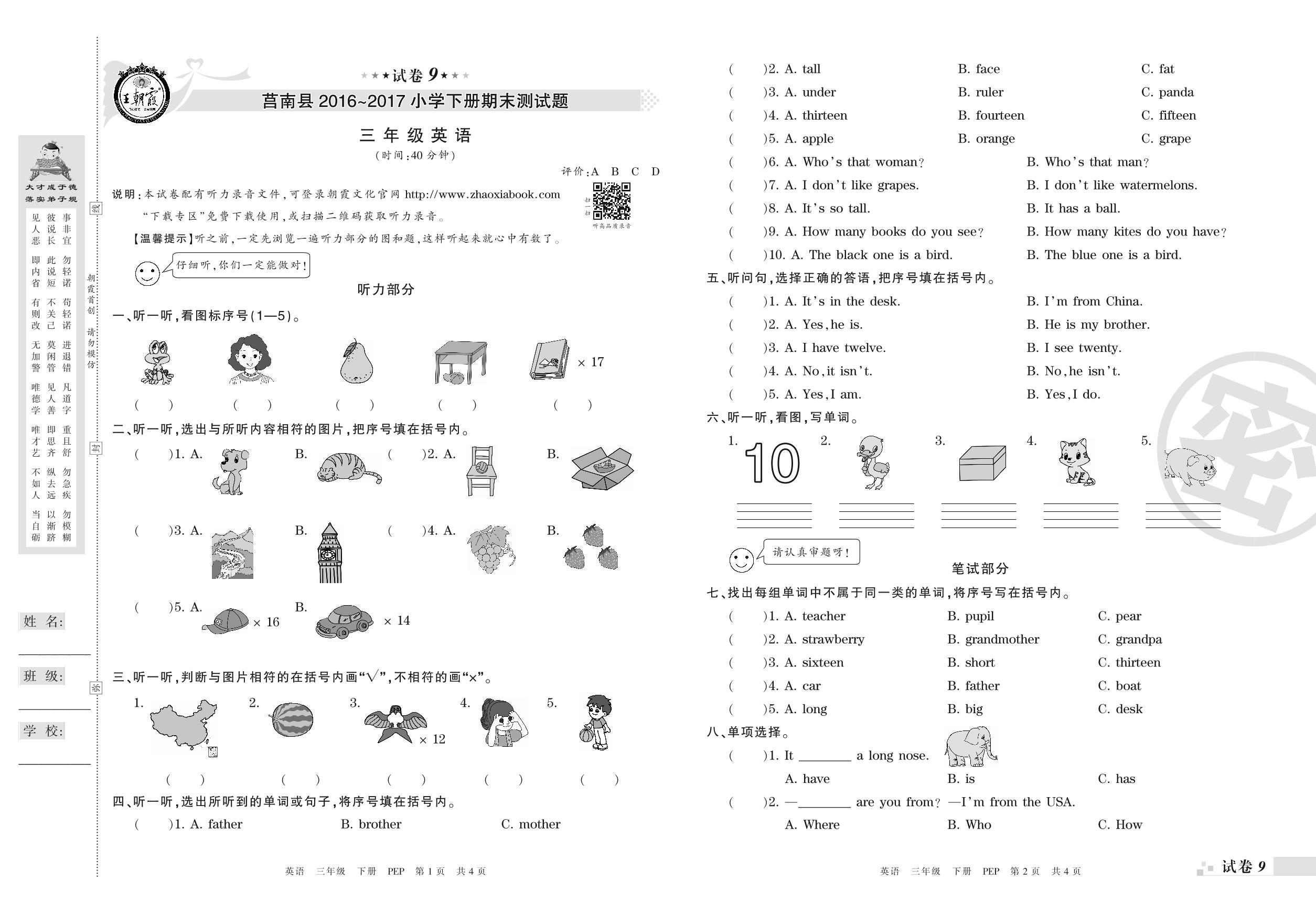 2016-2017学年第二学期临沂市莒南县三年级英语试卷(PEP版)【9】