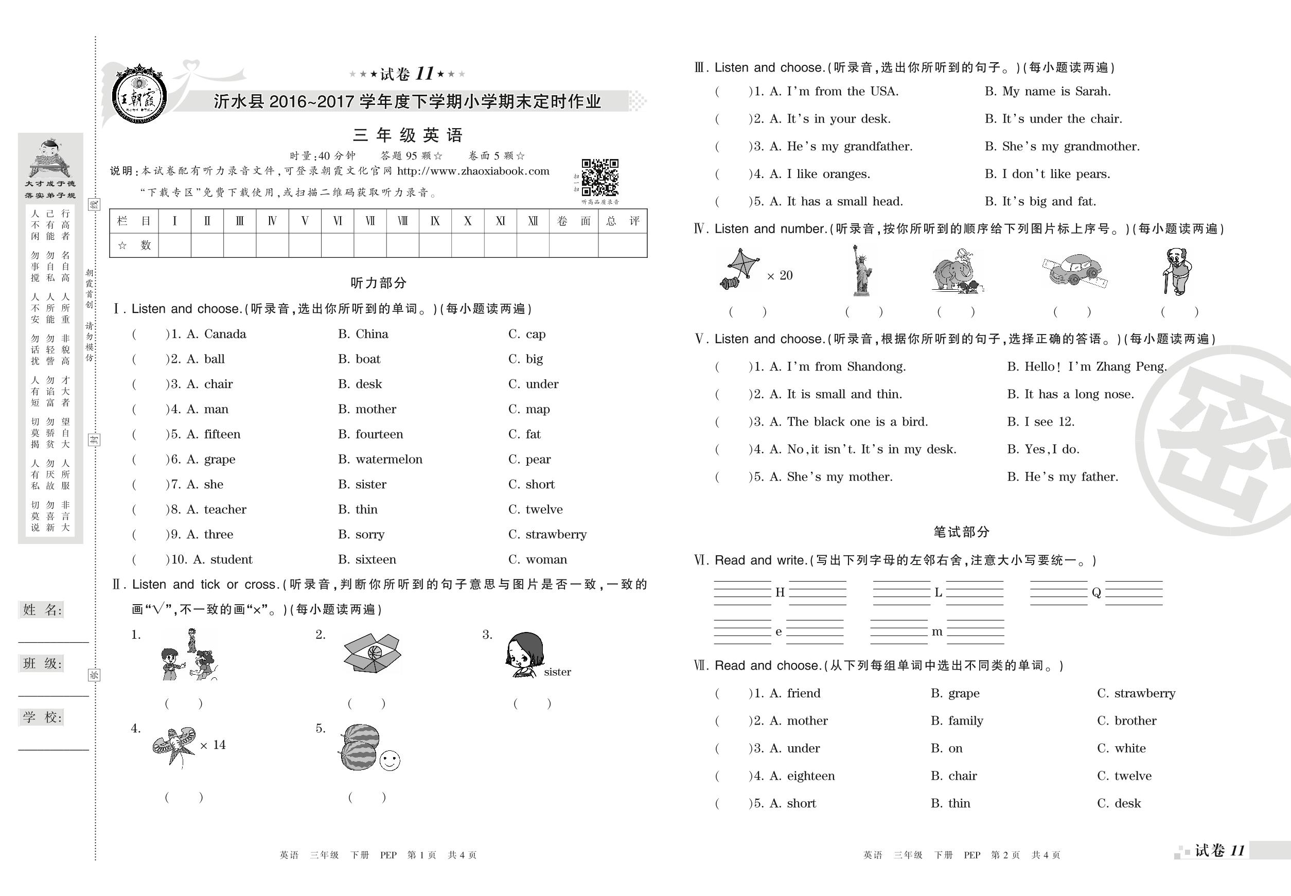 2016-2017学年第二学期临沂市沂水县三年级英语试卷(PEP版)【11】