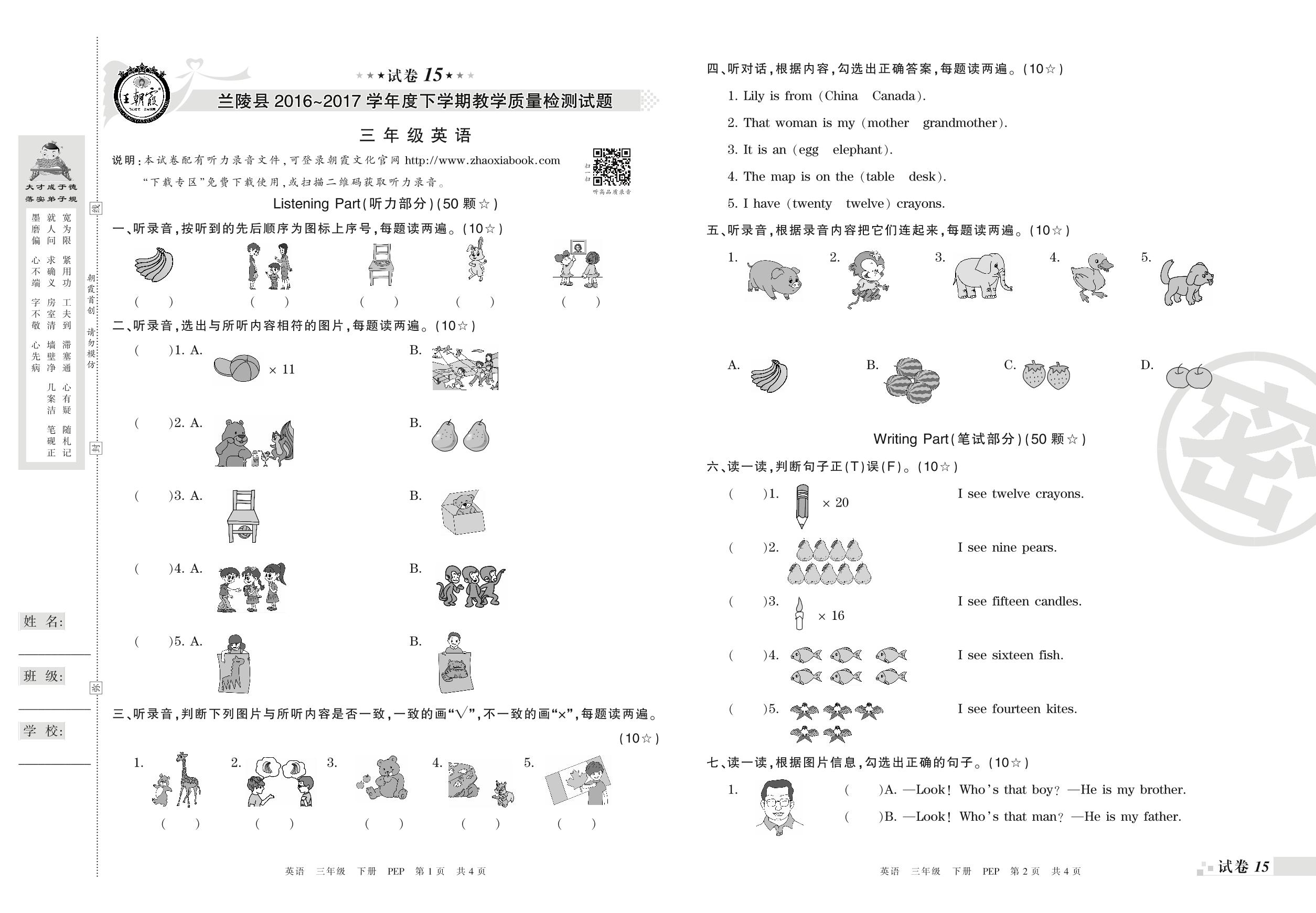 2016-2017学年第二学期临沂市兰陵县三年级英语试卷(PEP版)【15】