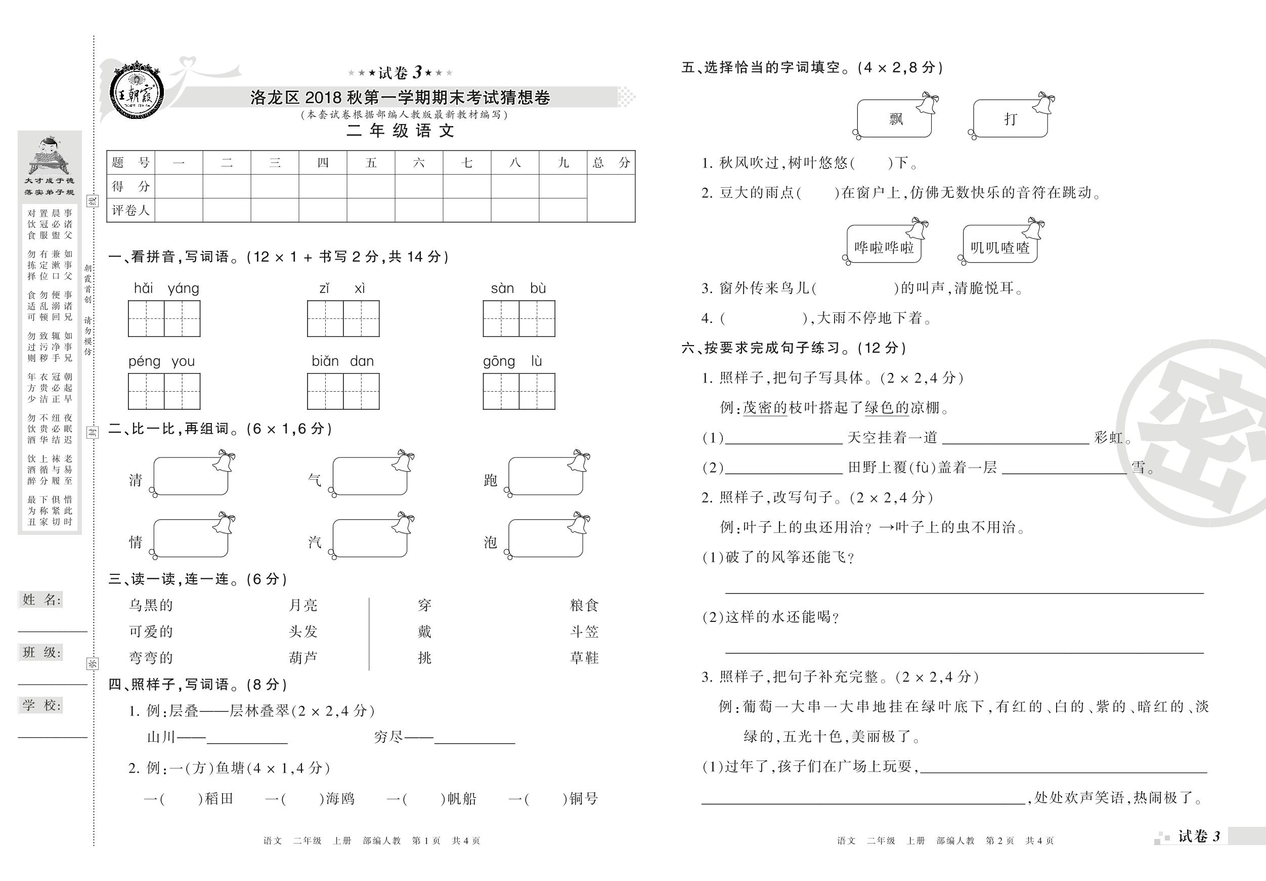 2018-2019学年第一学期洛阳市洛龙区二年级语文试卷(人教版)_R21080180945【3】