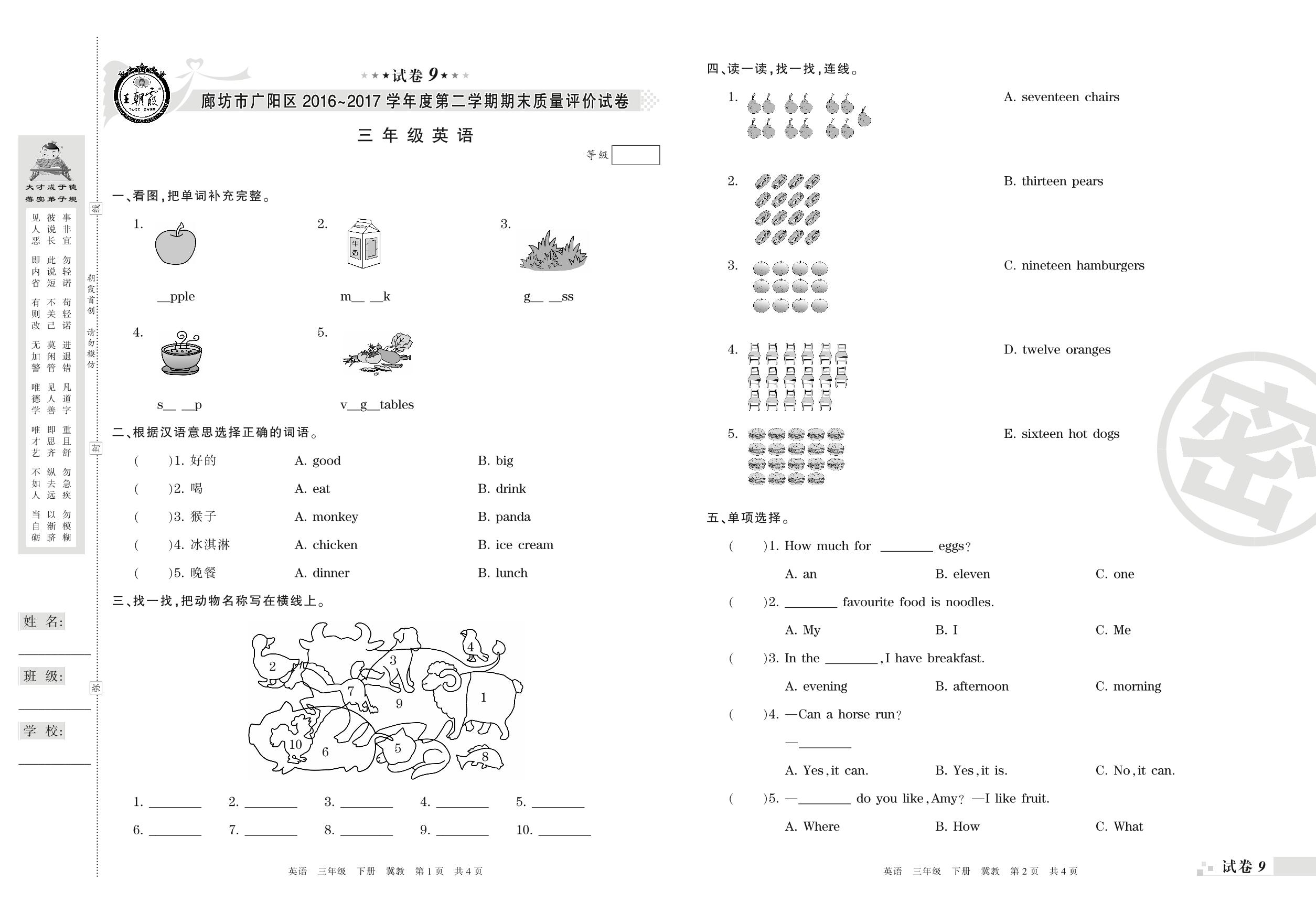 2016-2017学年第二学期廊坊市广阳区三年级英语试卷(冀教版)【9】