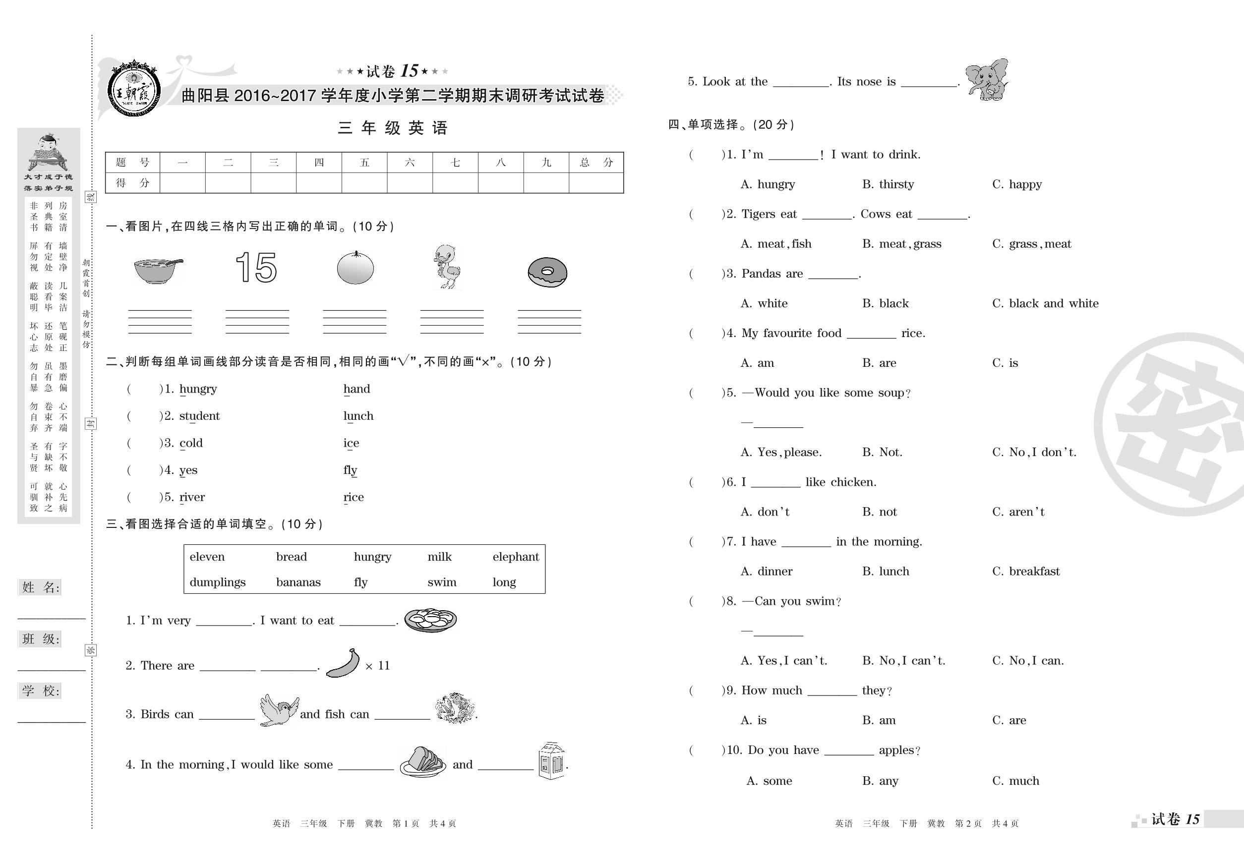 2016-2017学年第二学期保定市曲阳县三年级英语试卷(冀教版)【15】