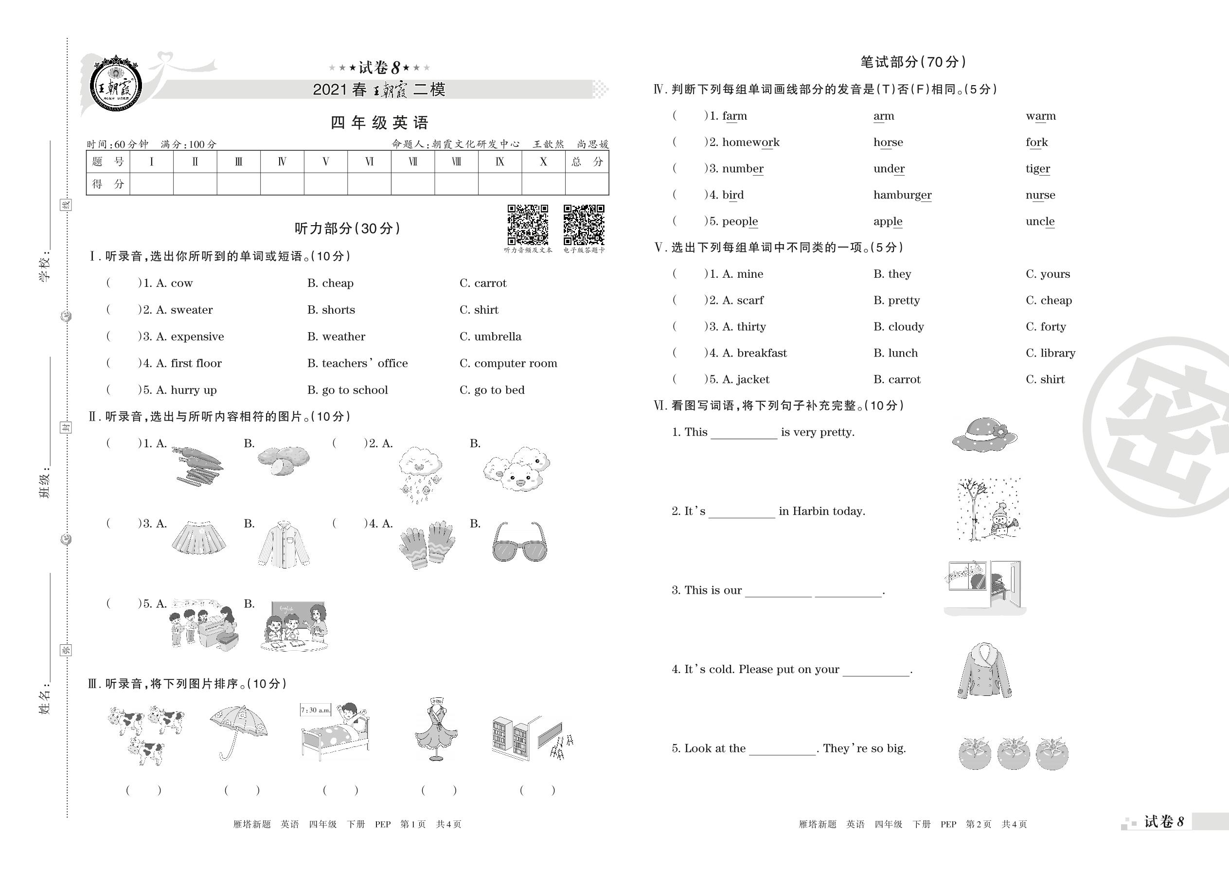 王朝霞期末模拟卷四年级下册英语(PEP版)_R21080783531【8】