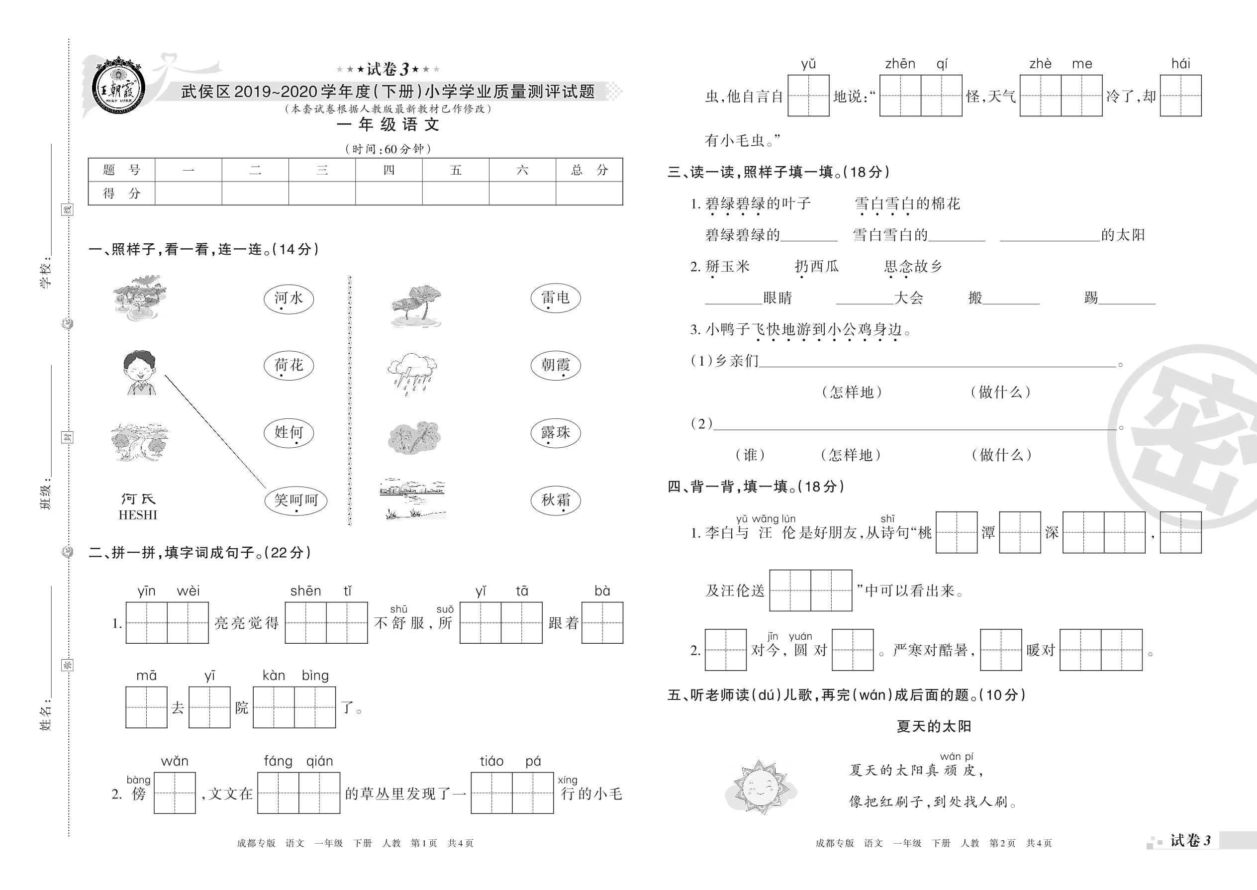 2019-2020学年第二学期成都市武侯区一年级语文试卷(人教版)【3】