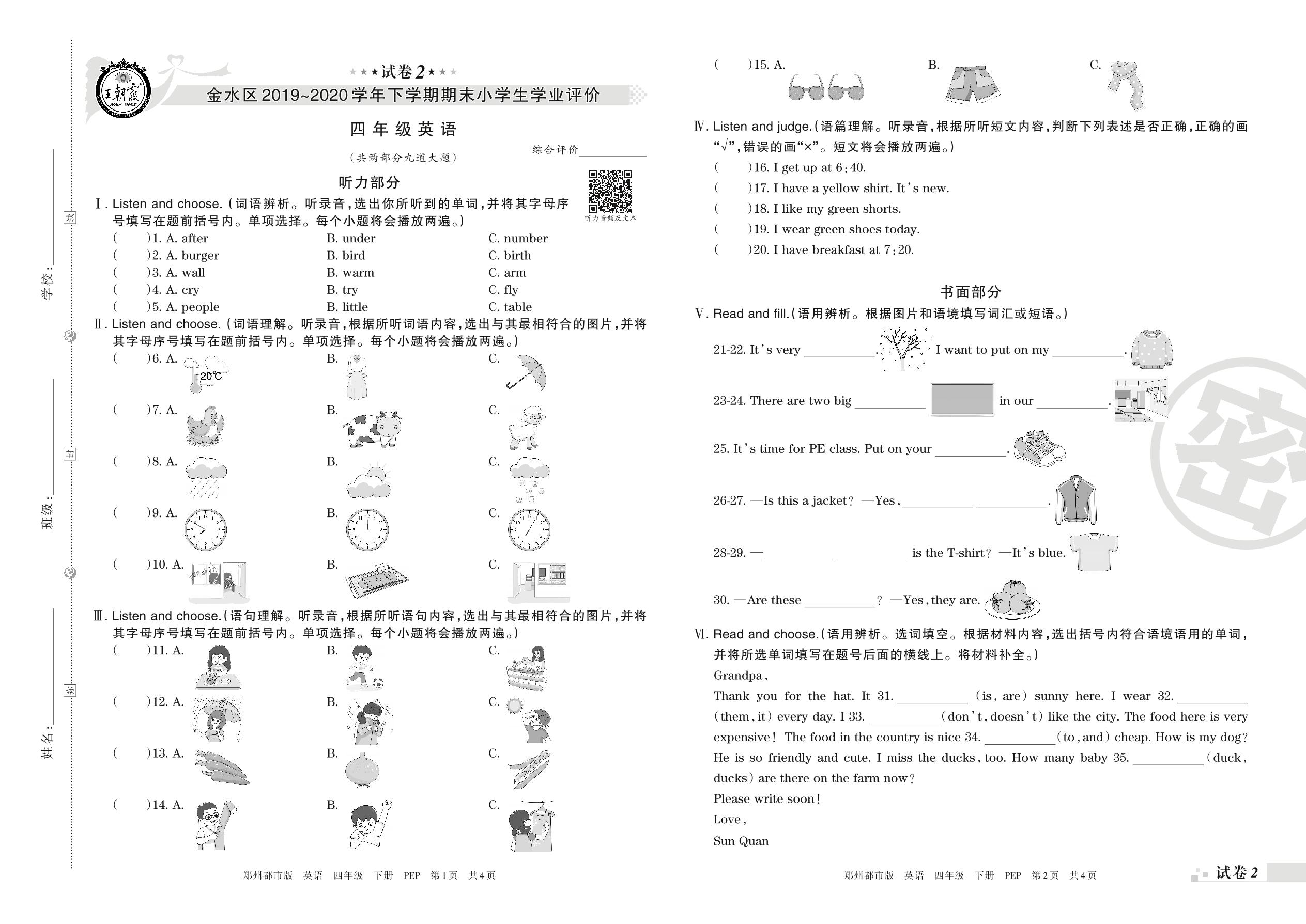 2019-2020学年第二学期郑州市金水区四年级英语试卷(PEP版)【2】