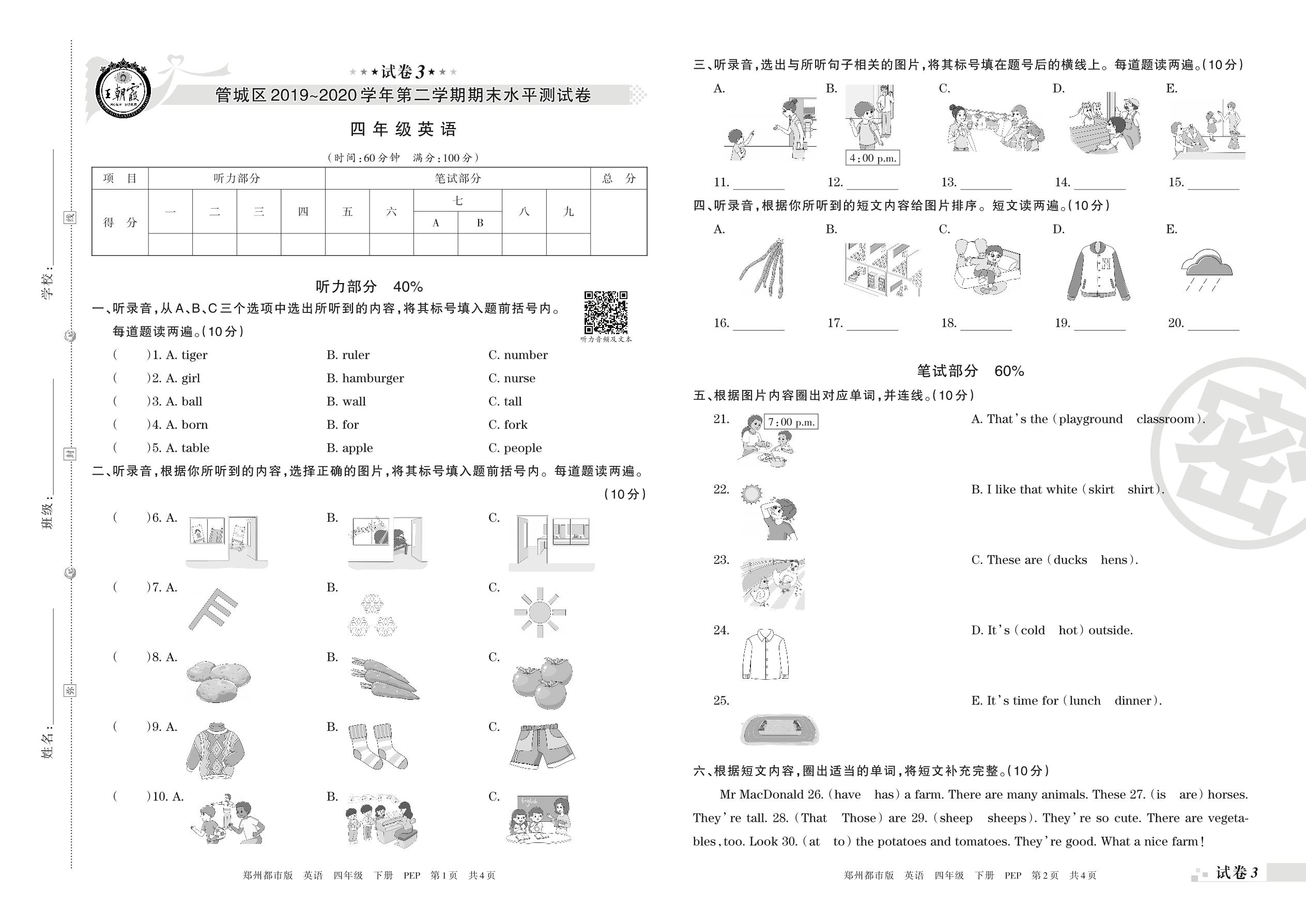 2019-2020学年第二学期郑州市管城区四年级英语试卷(PEP版)【3】