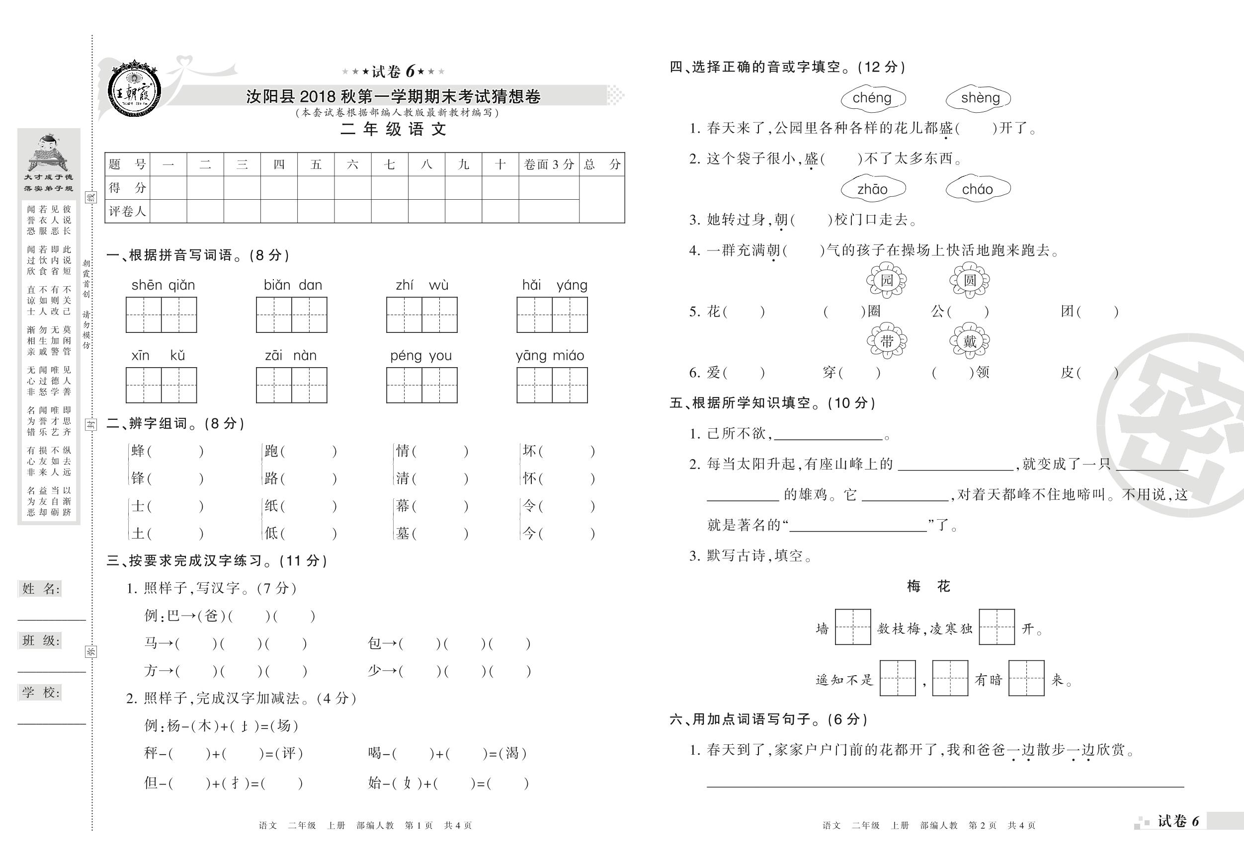 2018-2019学年第一学期洛阳市汝阳县二年级语文试卷(人教版)_R21080180952【6】