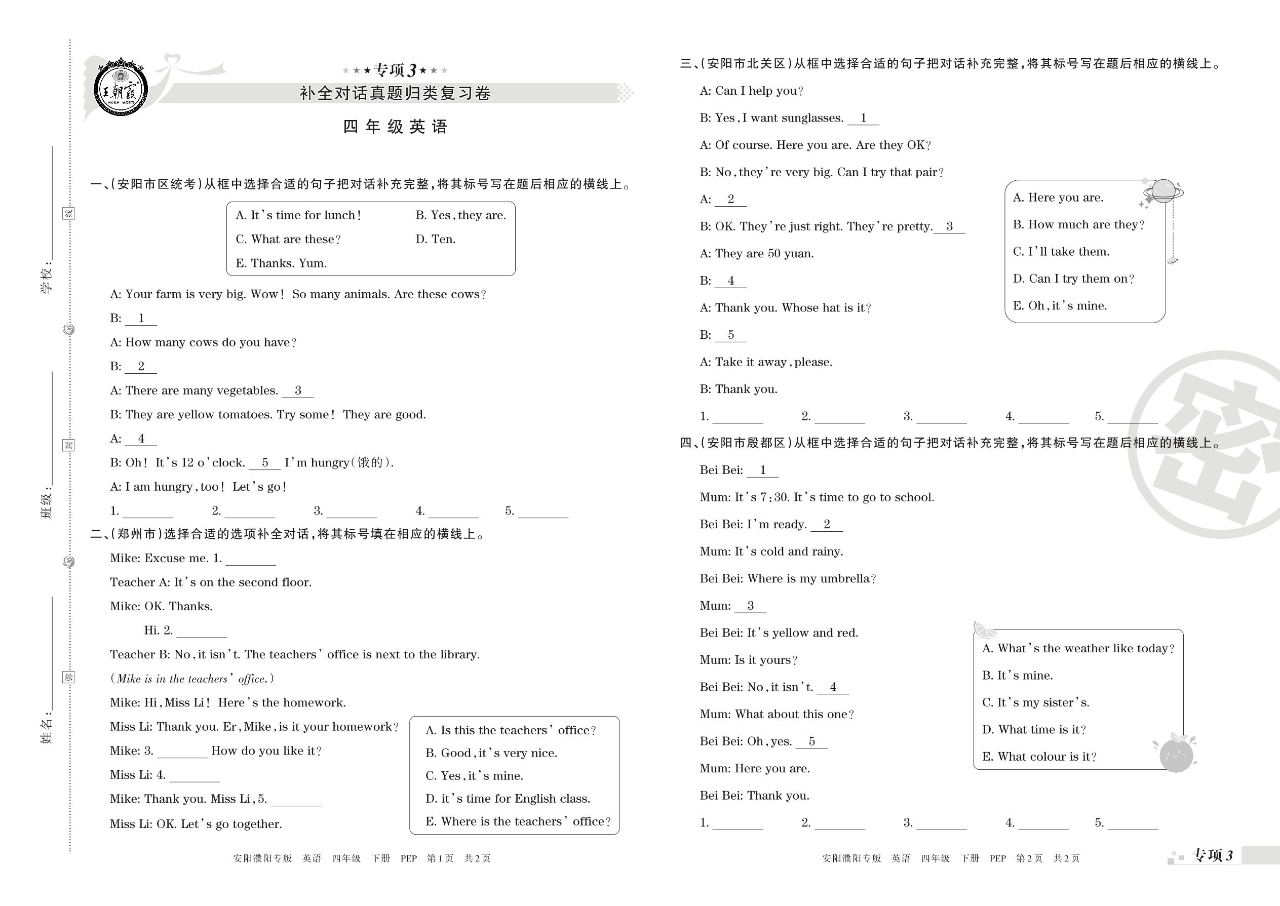 王朝霞期末专项卷——补全对话、阅读理解(一)真题归类复习四年级下册英语(PEP版)【0】