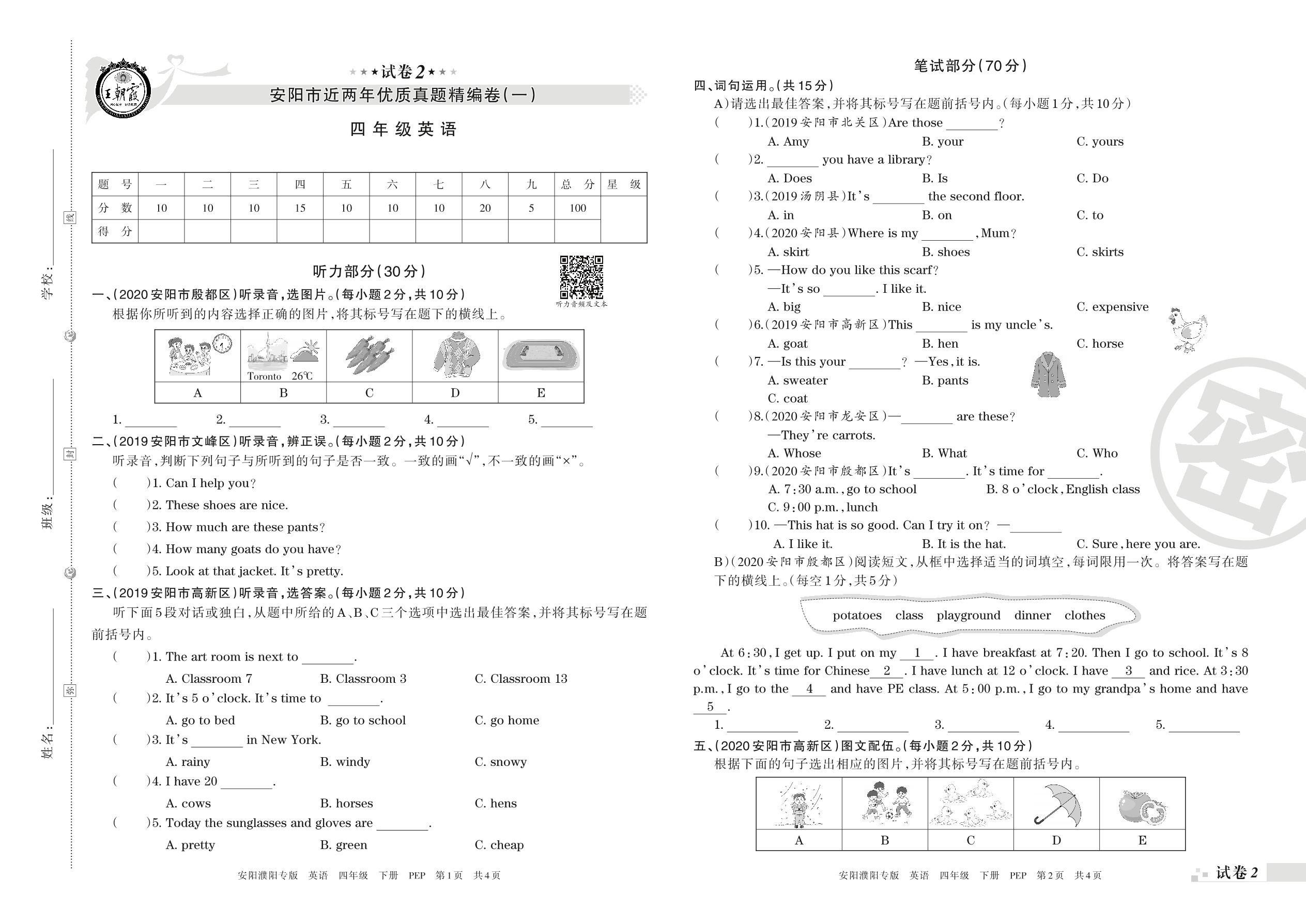 安阳市近两年优质真题精编卷(一)四年级下册英语(PEP版)【2】