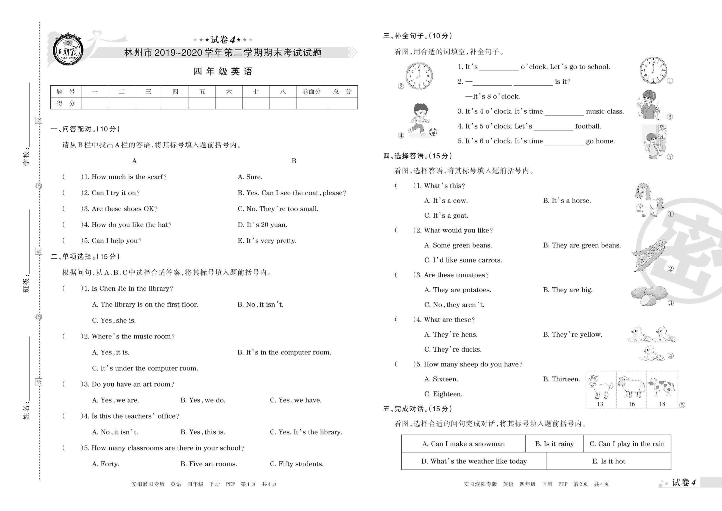 四年级英语人教PEP版(三起始)下册期末卷
