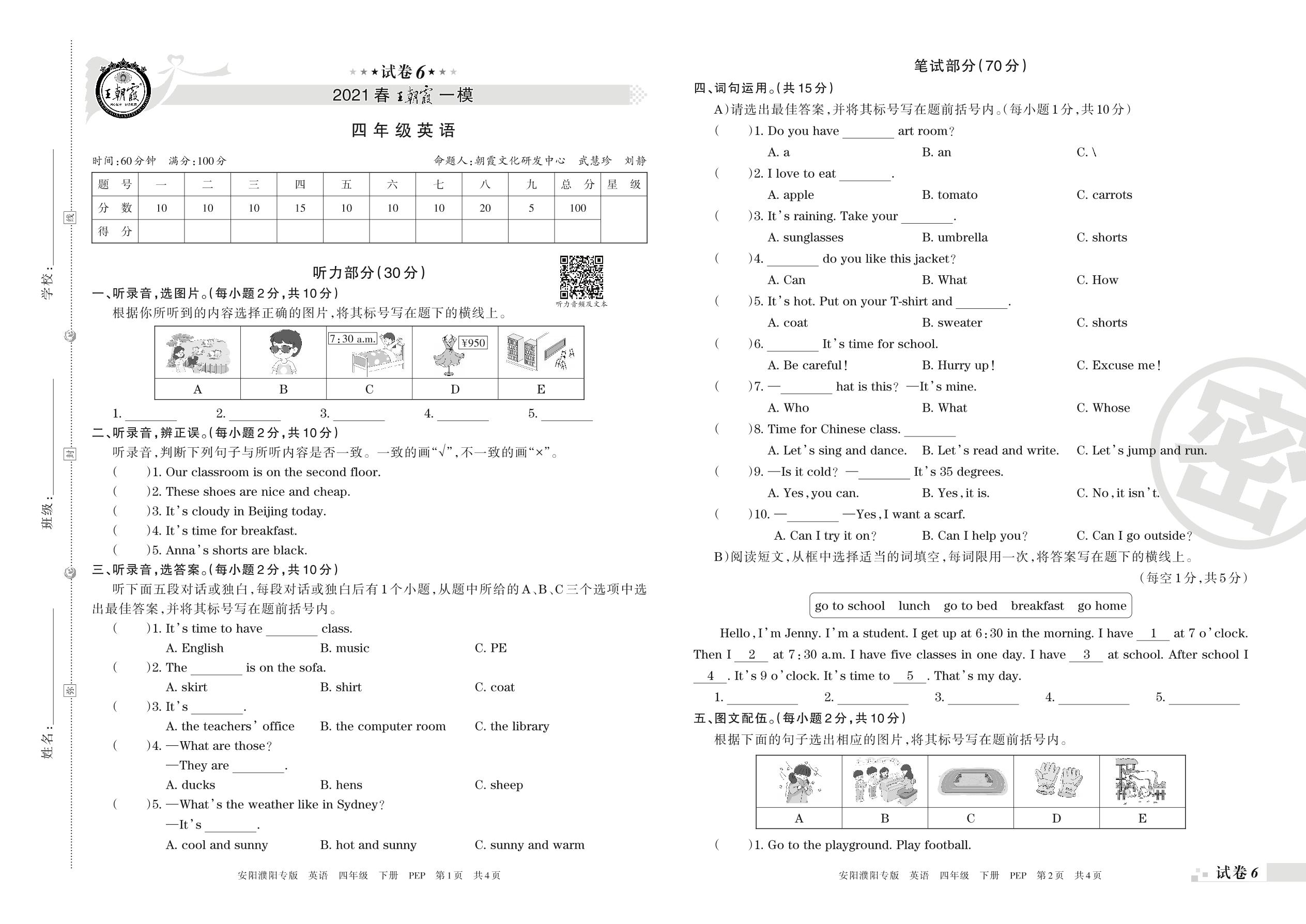 王朝霞期末模拟卷四年级下册英语(PEP版)【6】