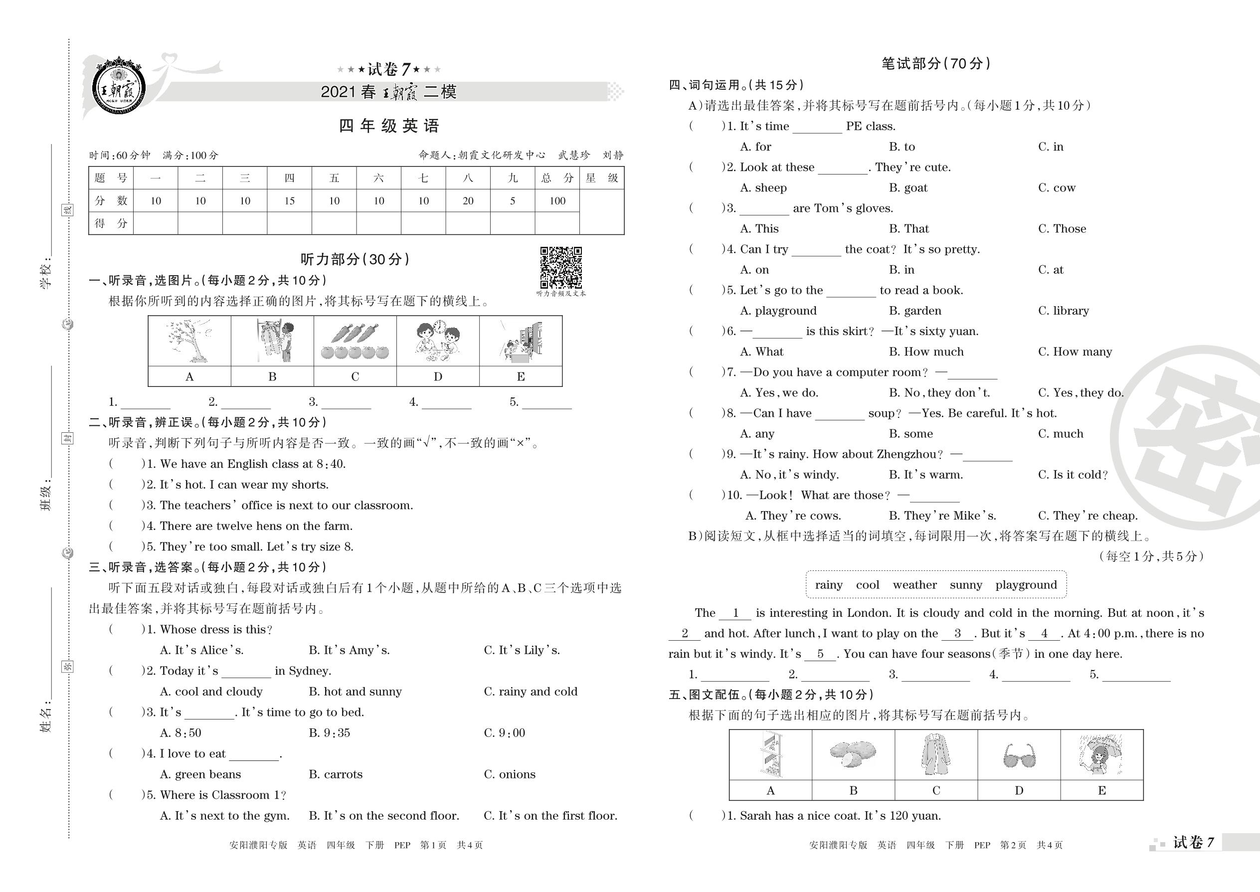 王朝霞期末模拟卷四年级下册英语(PEP版)_R21080783748【7】