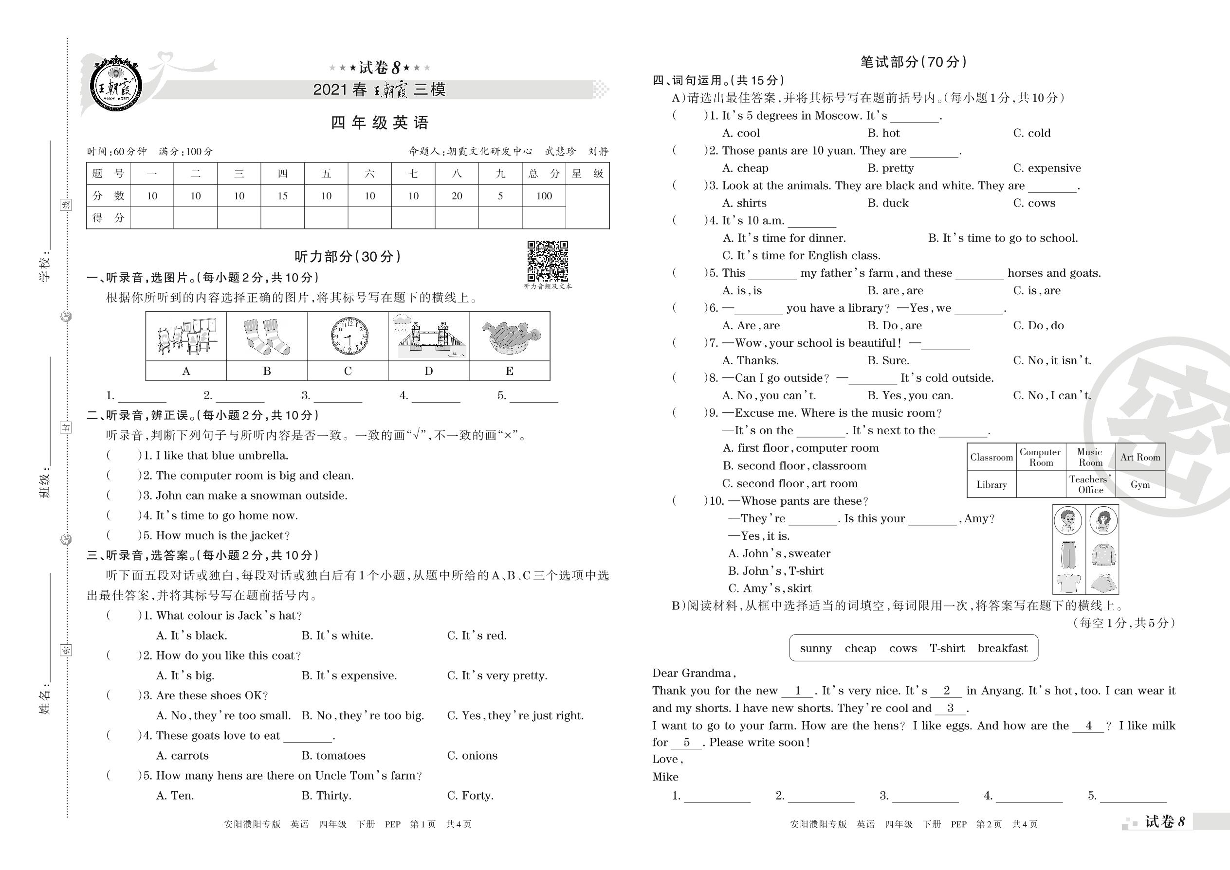 王朝霞期末模拟卷四年级下册英语(PEP版)_R21080783756【8】