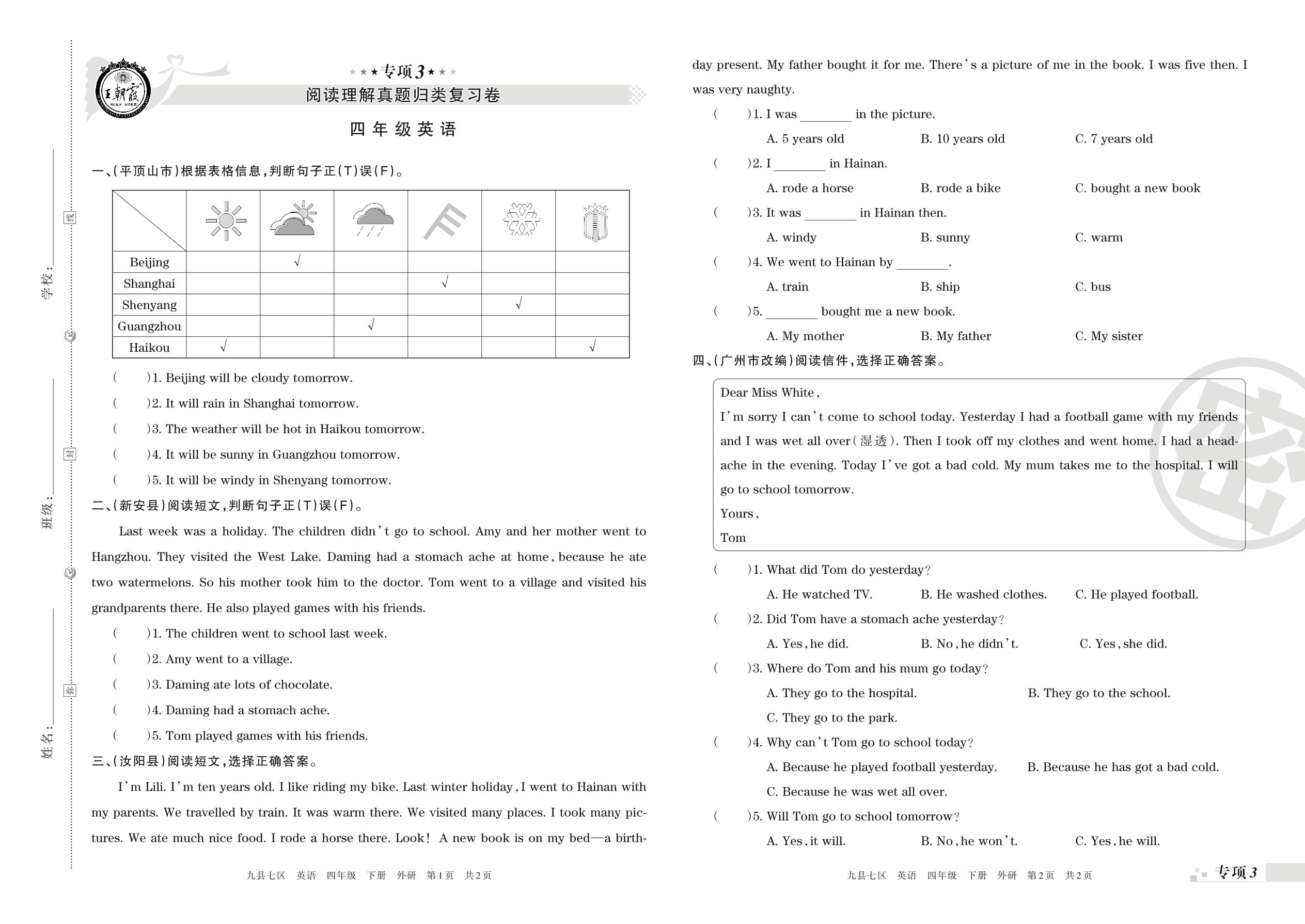 王朝霞期末专项卷阅读理解真题归类复习、补全短文与仿写四年级下册英语(外研版)_R21080783808【0】