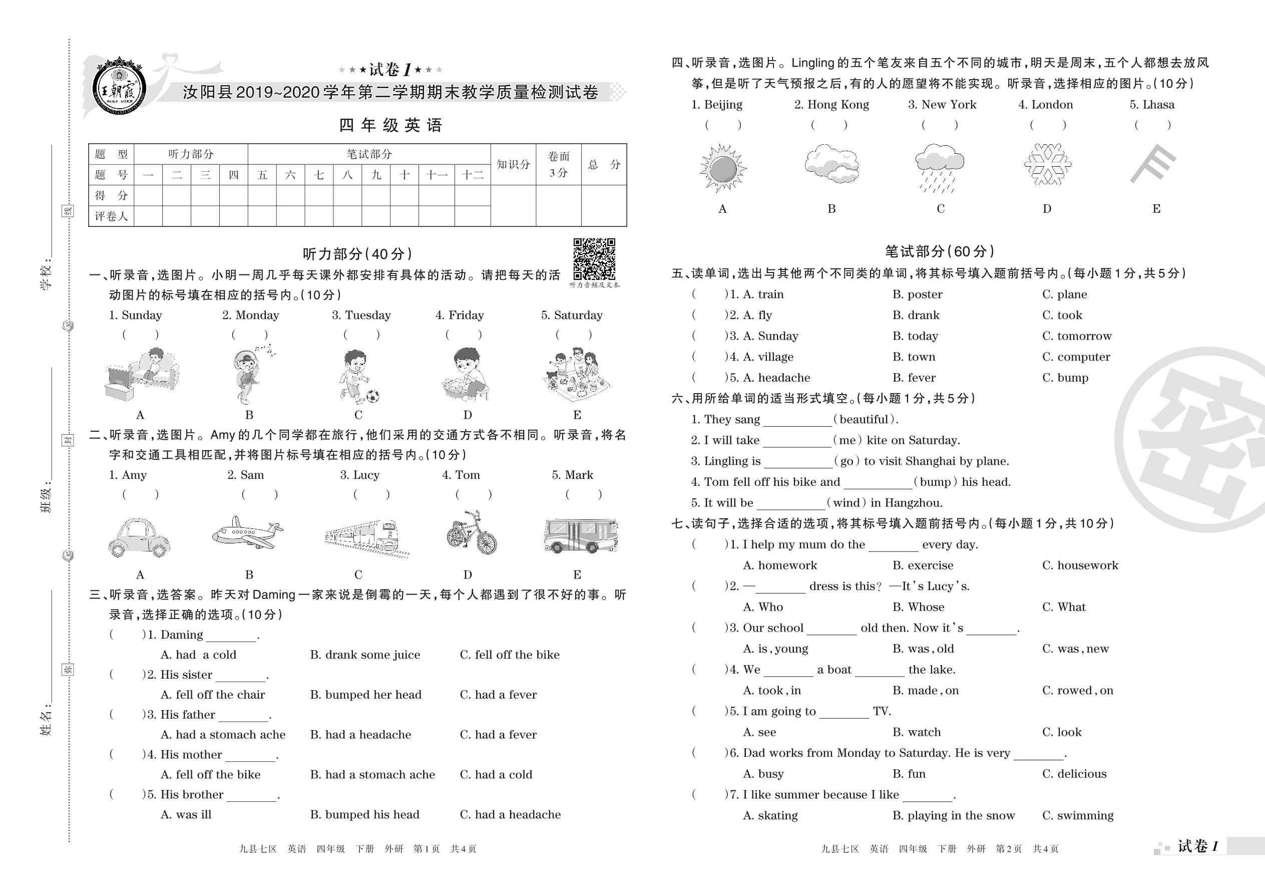 2019-2020学年第二学期洛阳市汝阳县四年级英语试卷(外研版)【1】