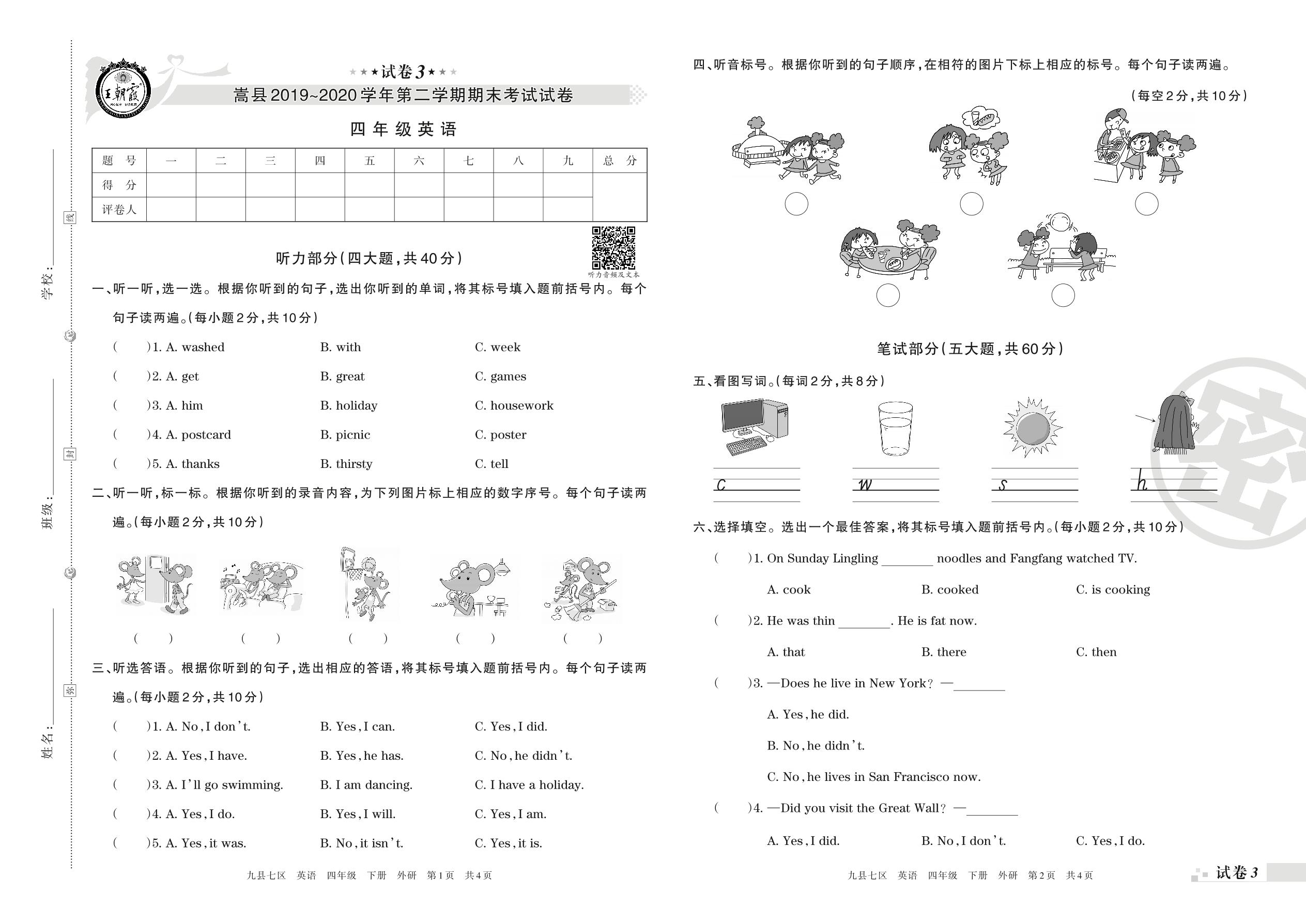 2019-2020学年第二学期洛阳市嵩县四年级英语试卷(外研版)【3】