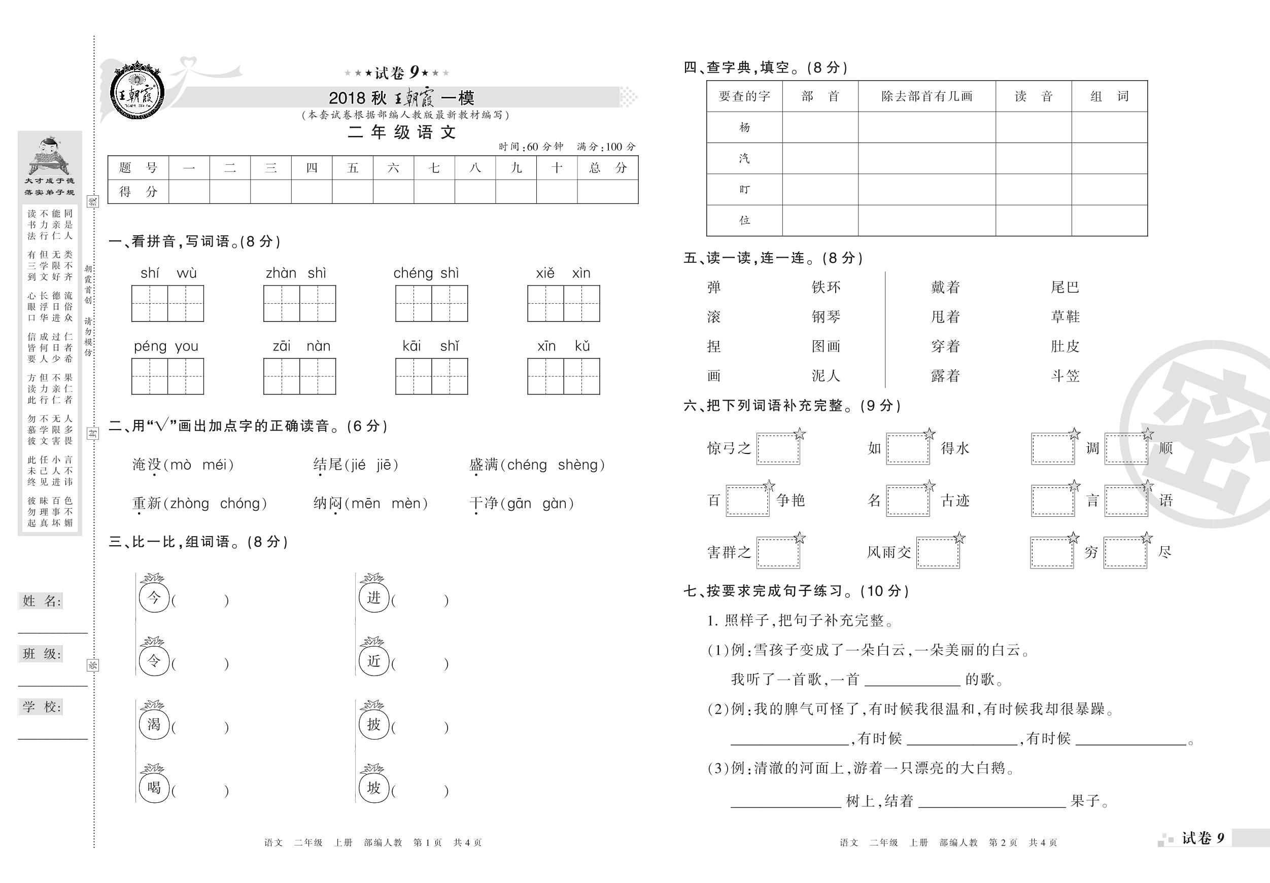 王朝霞期末模拟卷二年级上册语文(人教版)_R21080180958【9】