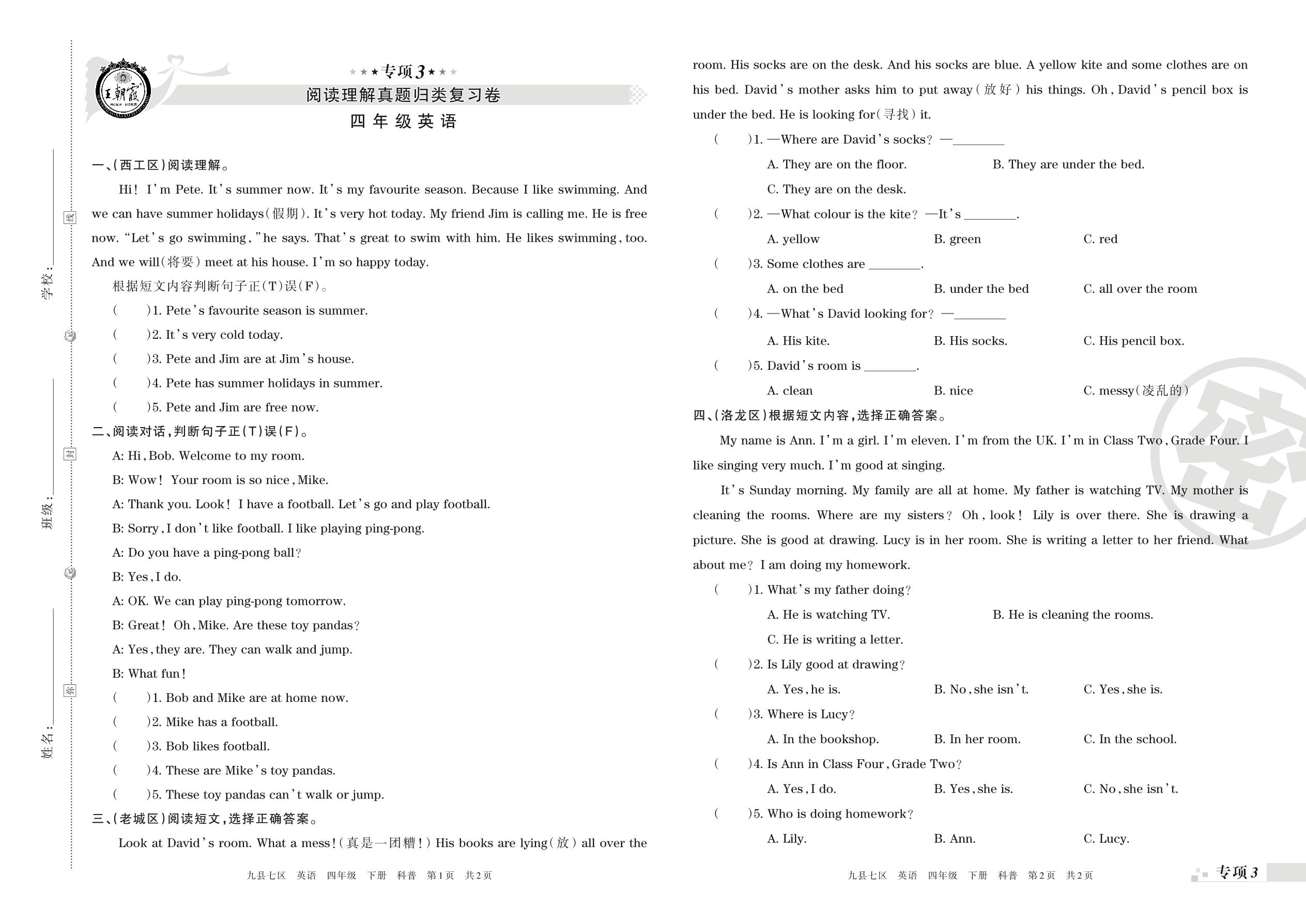 王朝霞期末专项卷——阅读理解真题归类复习、补全短文四年级下册英语(科普版)_R21080783910【0】