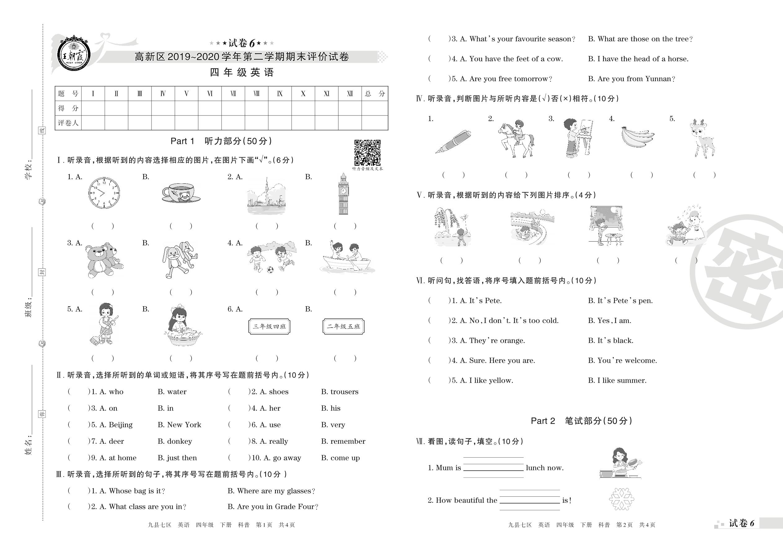 2019-2020学年第二学期洛阳市高新区四年级英语试卷(科普版)【6】