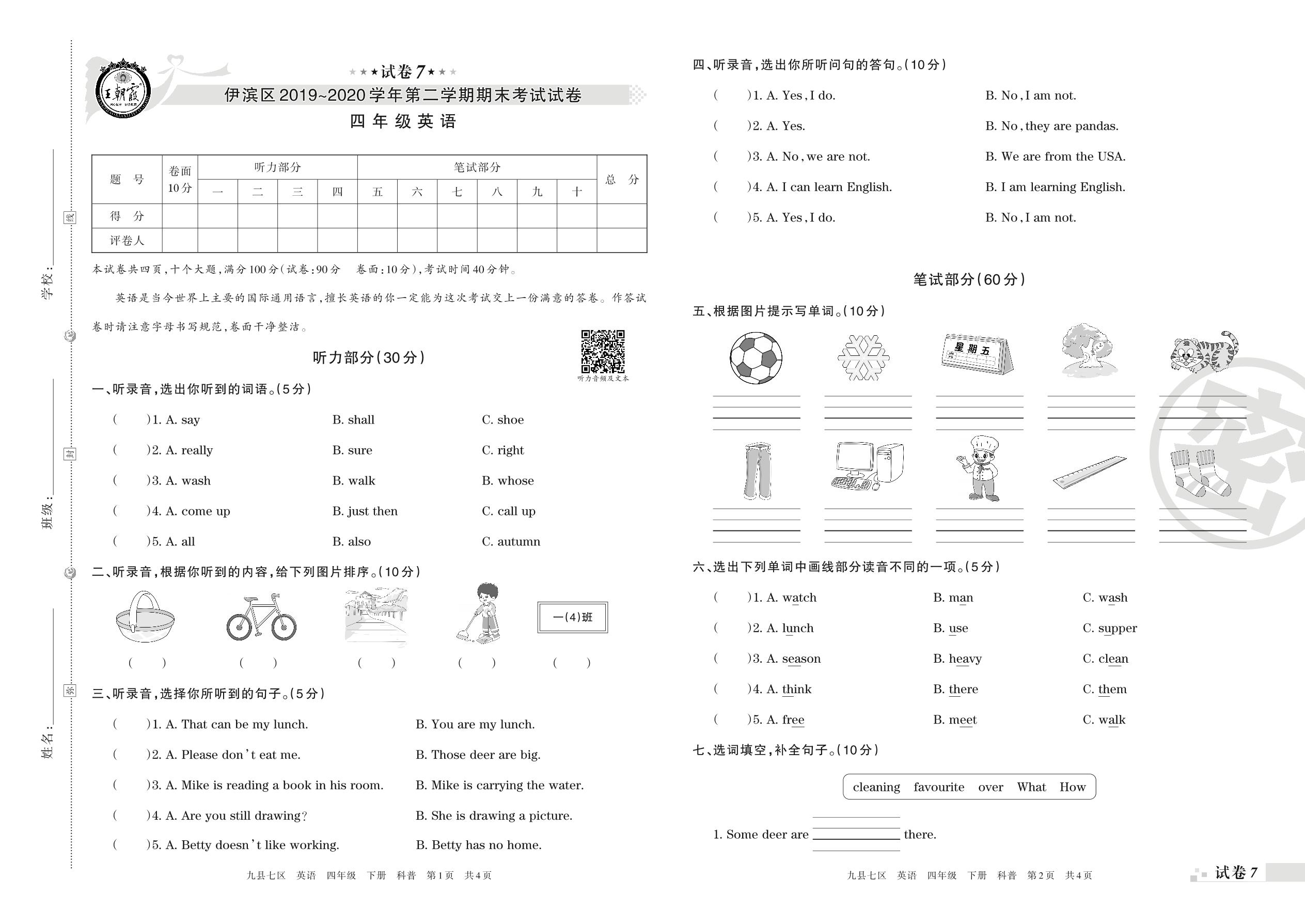 2019-2020学年第二学期洛阳市伊滨区四年级英语试卷(科普版)【7】