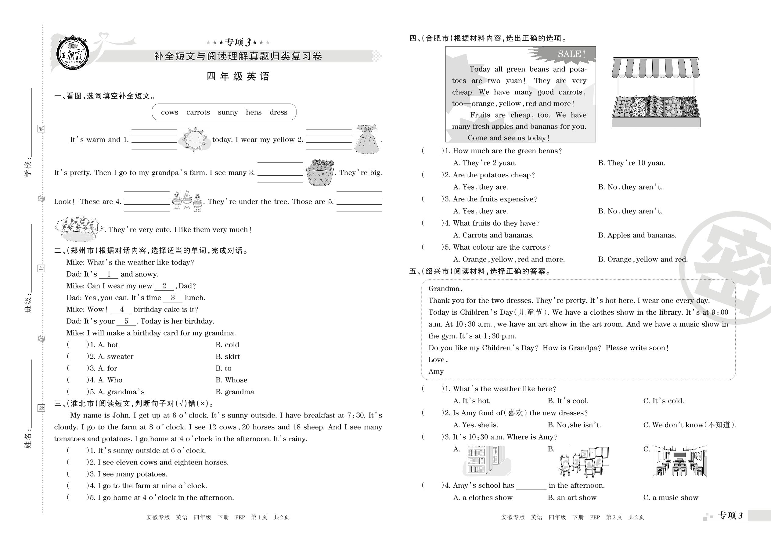 王朝霞期末专项卷——补全短文与阅读理解真题归类复习、任务型阅读四年级下册英语(PEP版)【0】