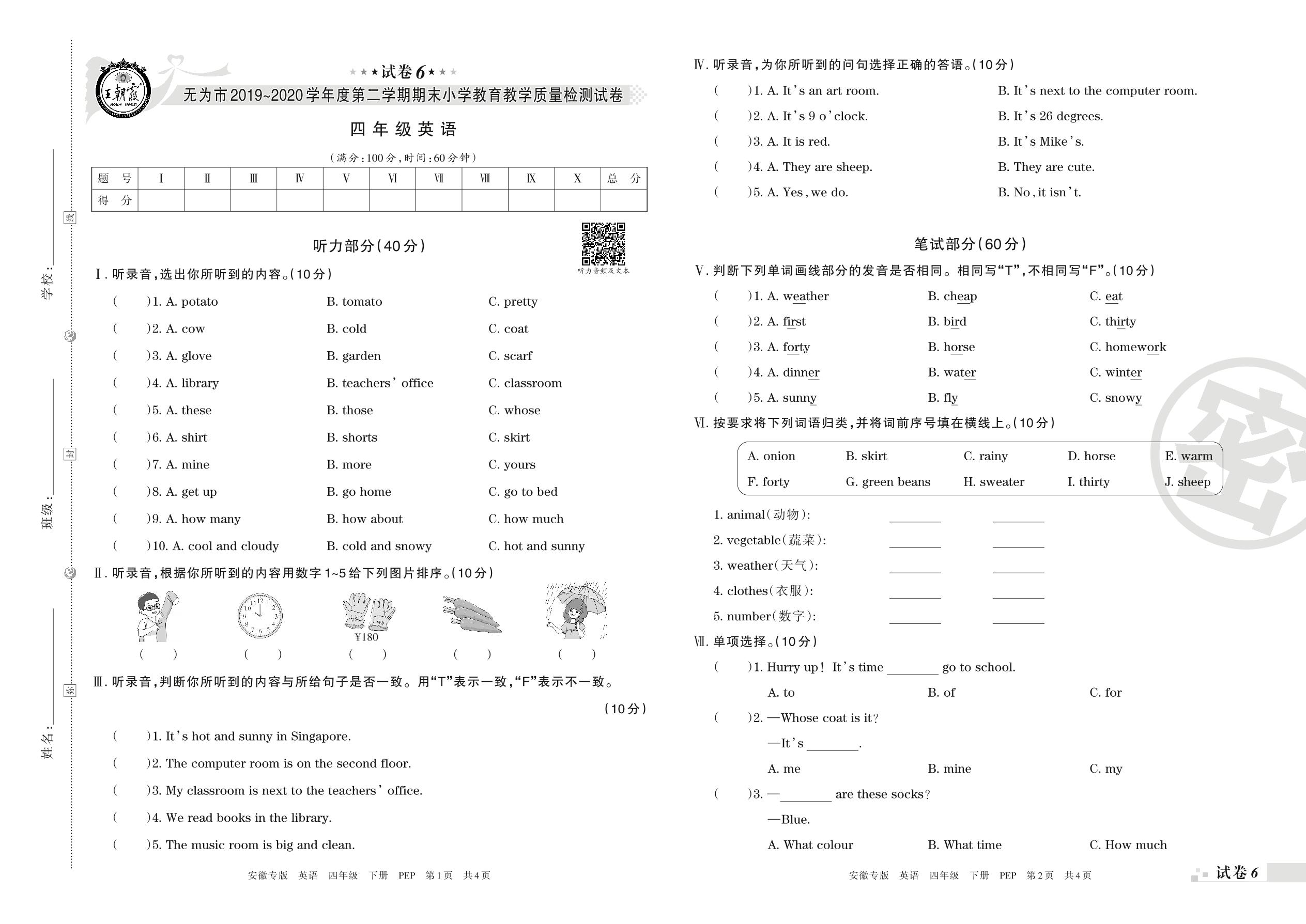 2019-2020学年第二学期无为市四年级英语试卷(PEP版)【6】