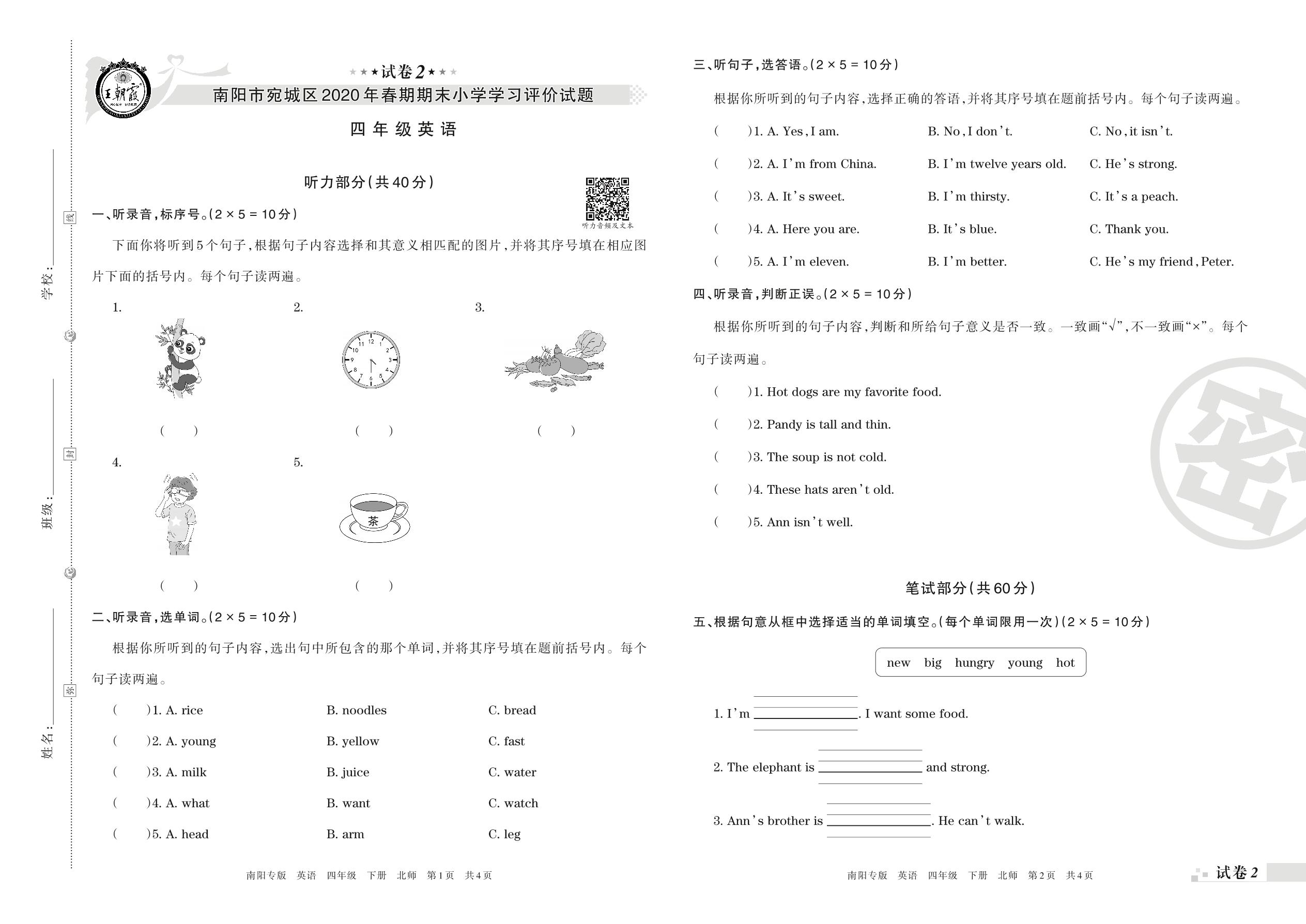 2019-2020学年第二学期南阳市宛城区四年级英语试卷(北师版)【2】