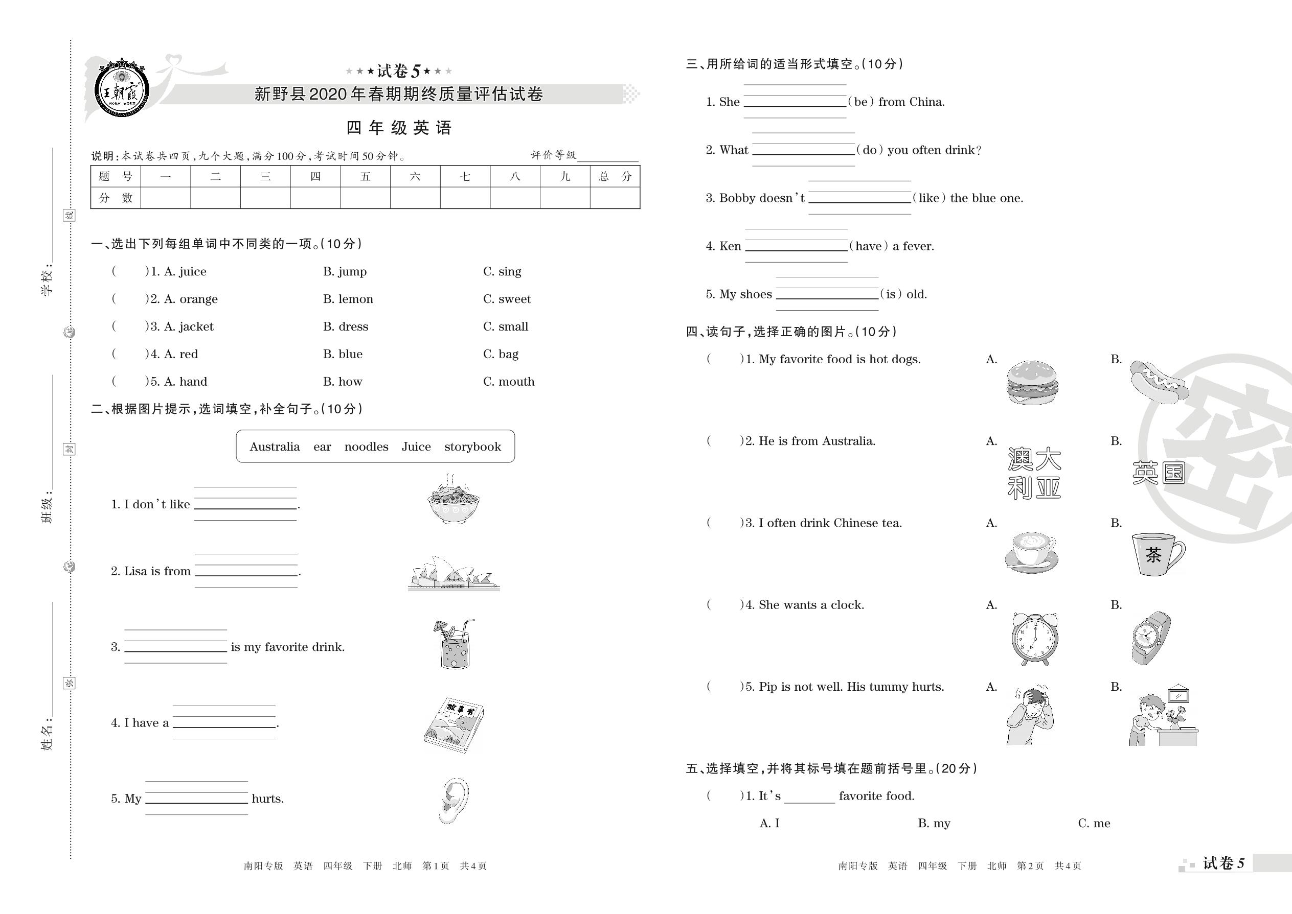 2019-2020学年第二学期南阳市新野县四年级英语试卷(北师版)【5】