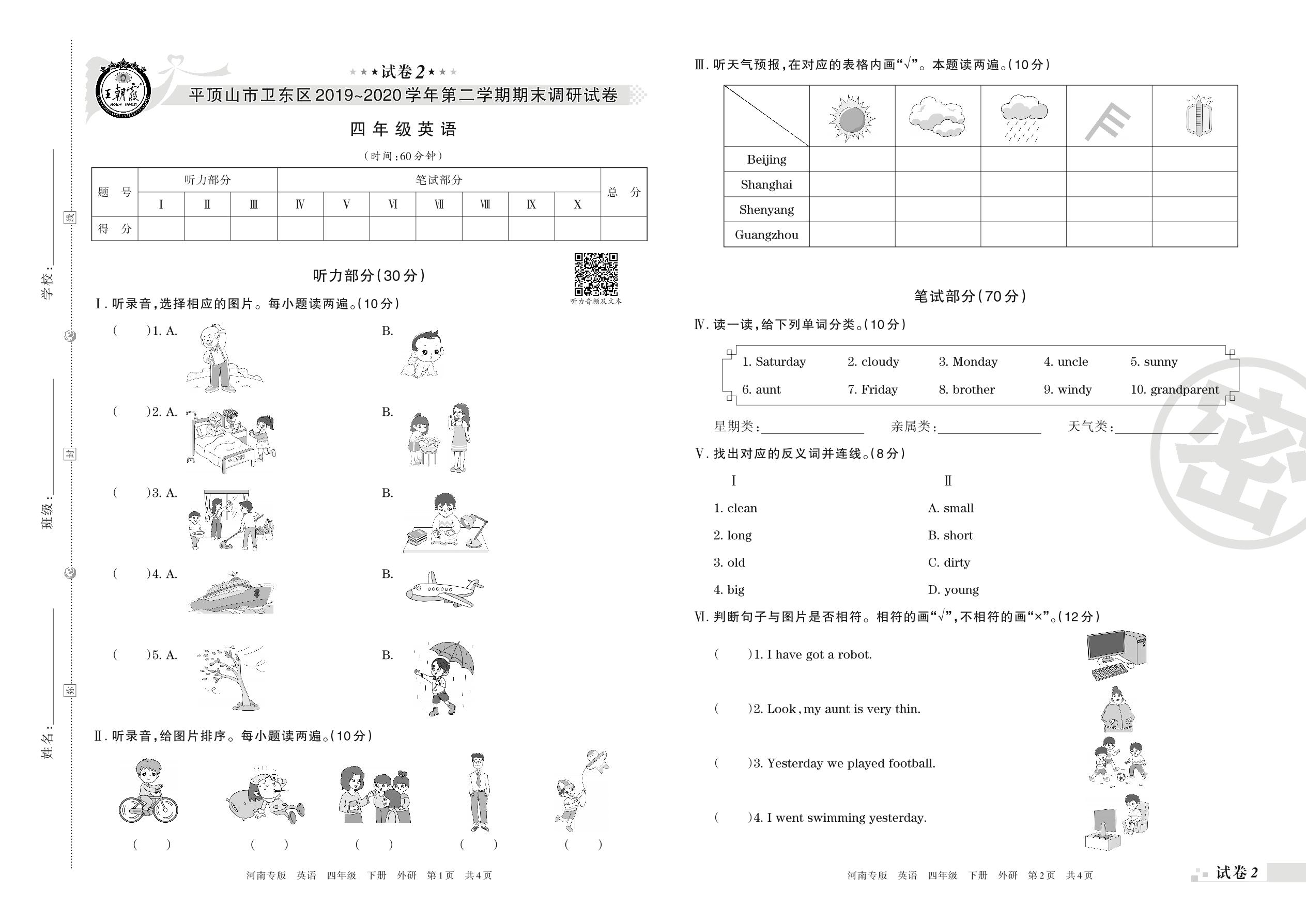 2019-2020学年第二学期平顶山市卫东区四年级英语试卷(外研版)【2】