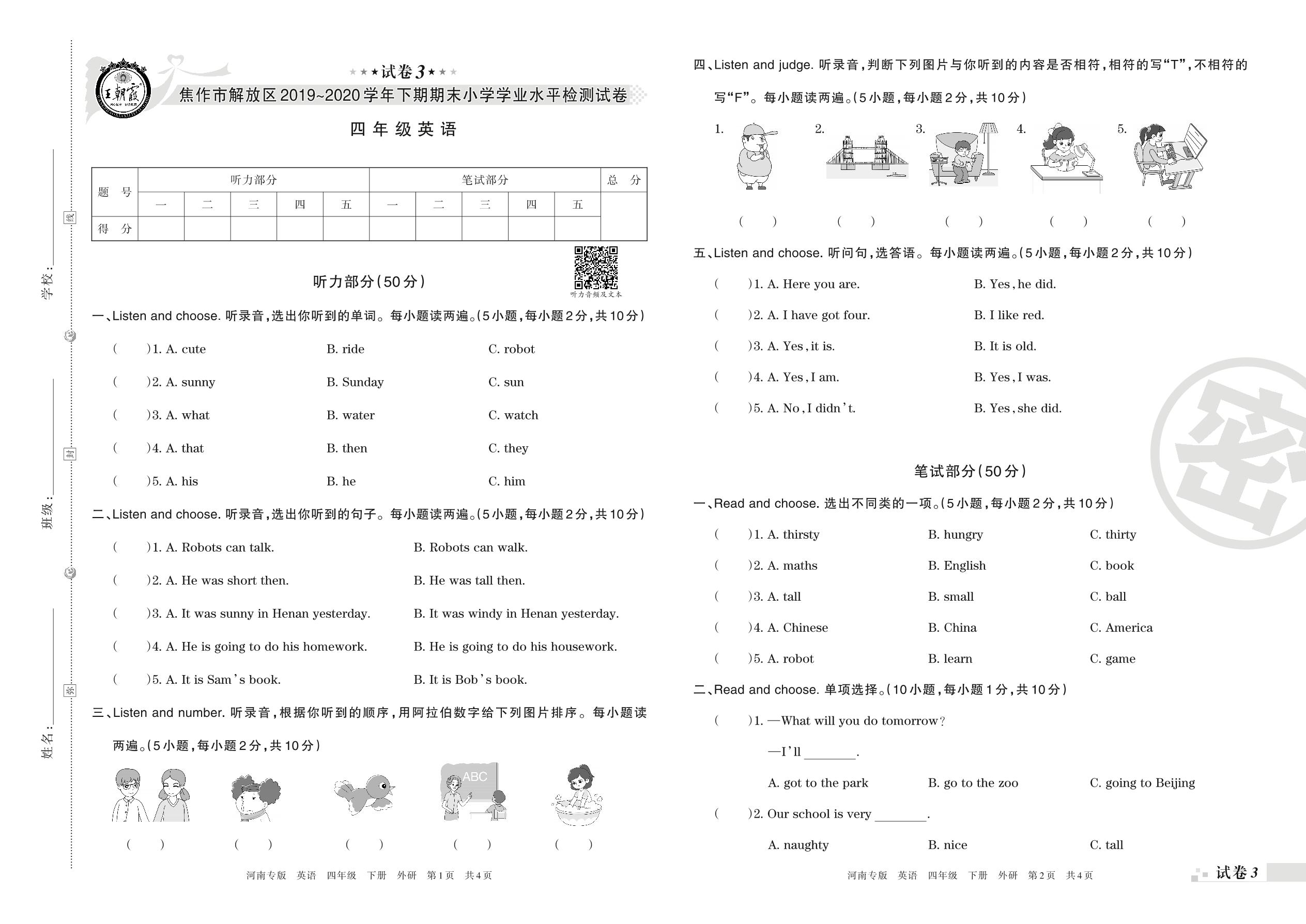 2019-2020学年第二学期焦作市解放区四年级英语试卷(外研版)【3】