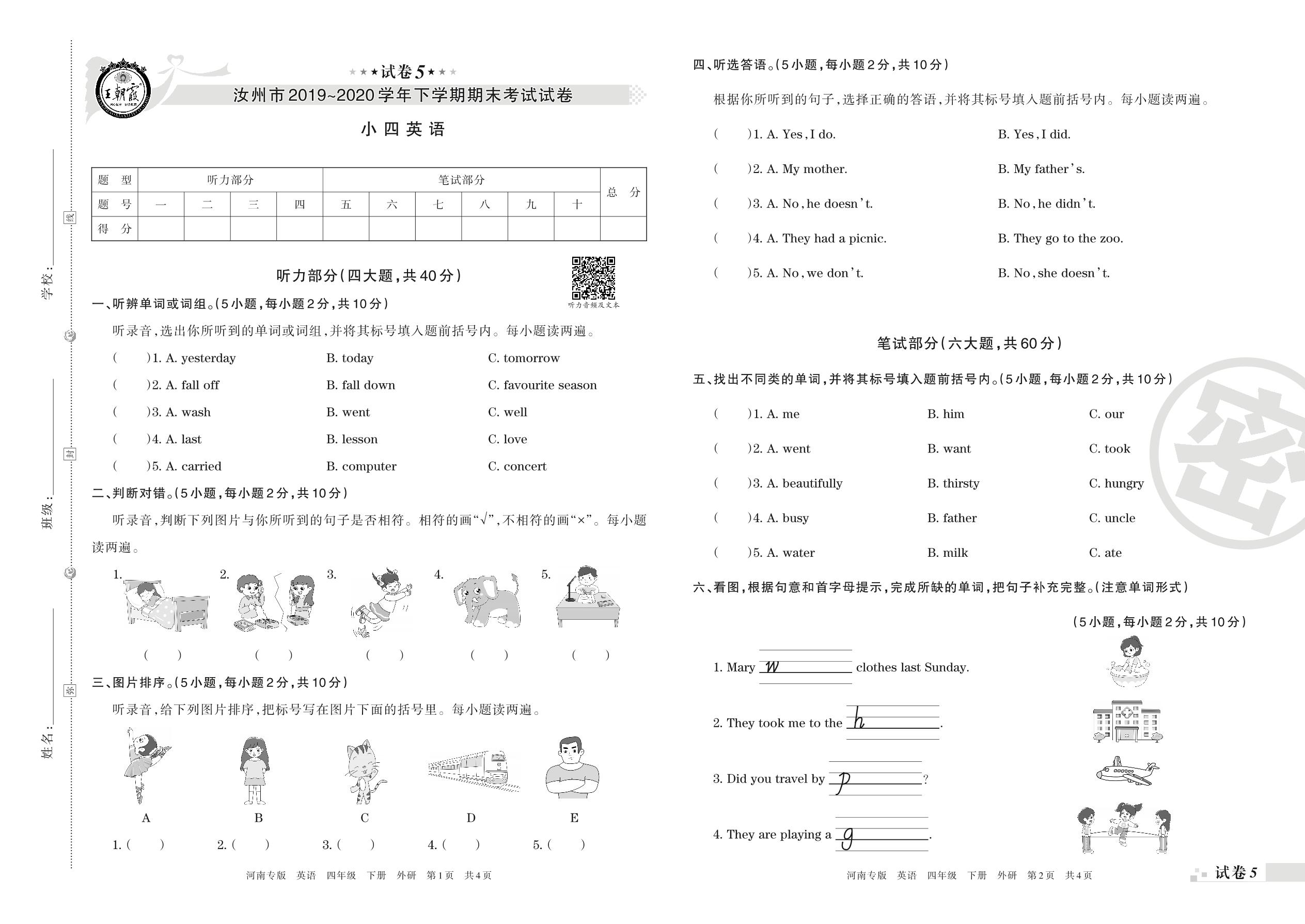 2019-2020学年第二学期汝州市四年级英语试卷(外研版)【5】
