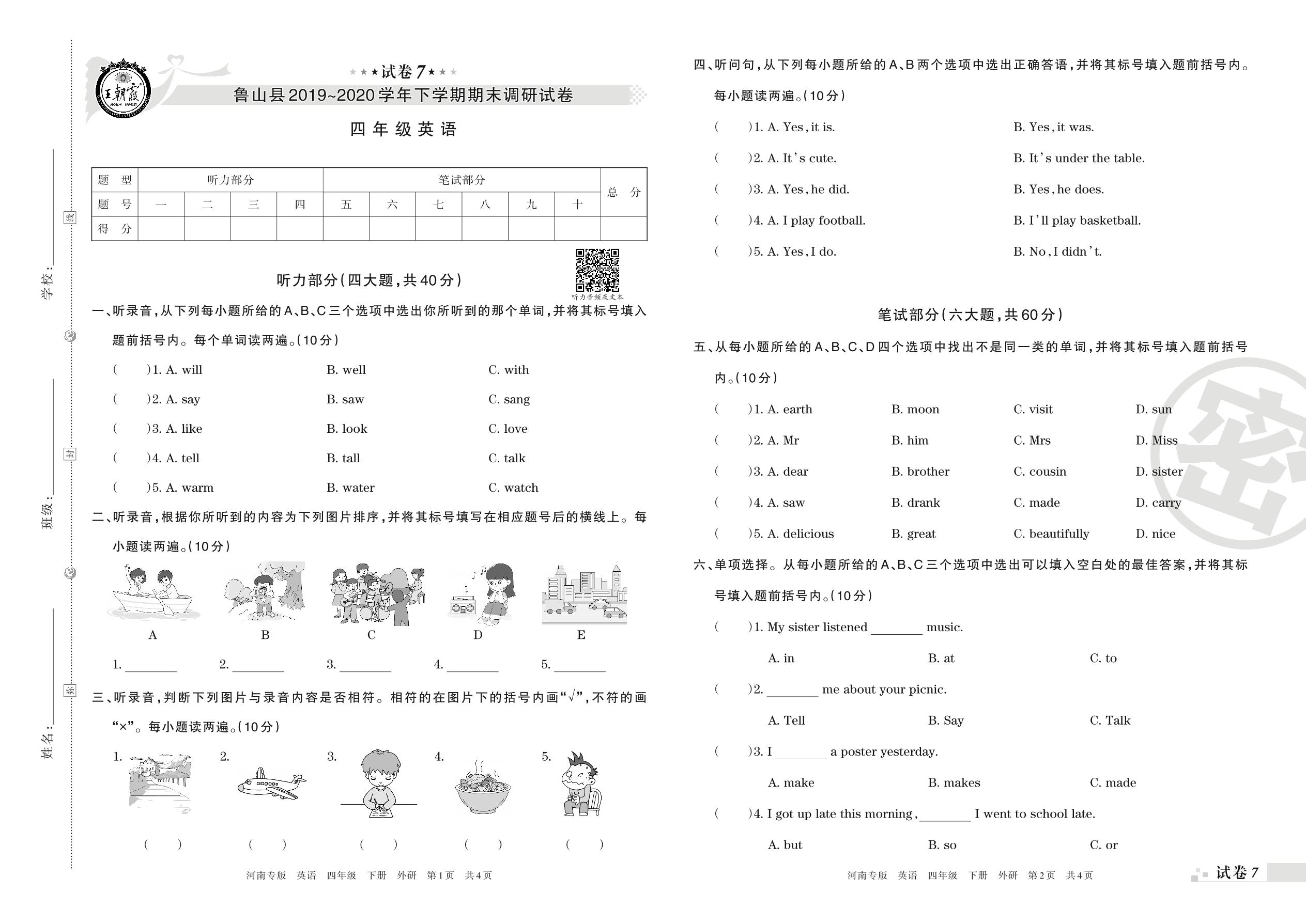 2019-2020学年第二学期平顶山市鲁山县四年级英语试卷(外研版)【7】