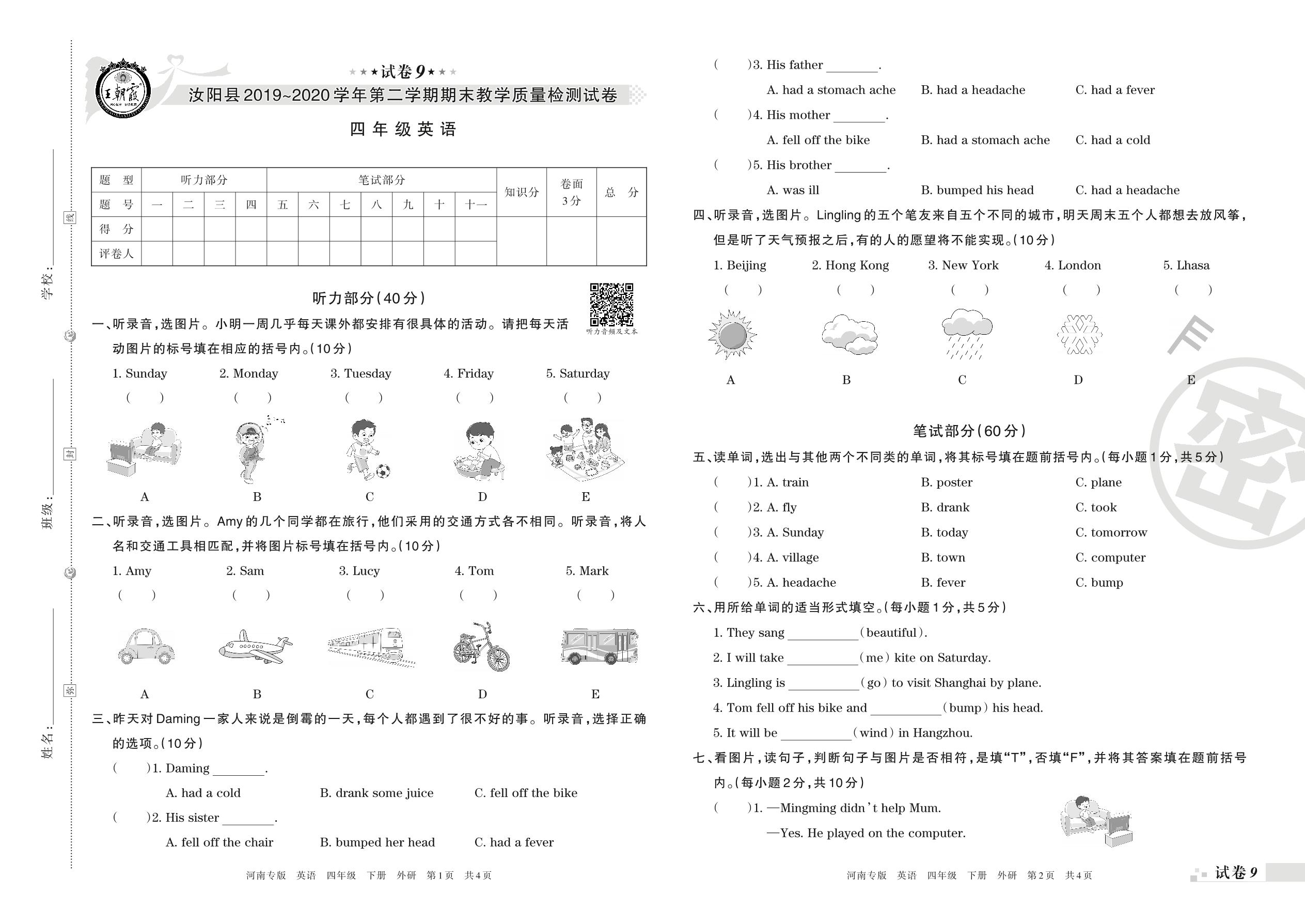 2019-2020学年第二学期洛阳市汝阳县四年级英语试卷(外研版)【9】