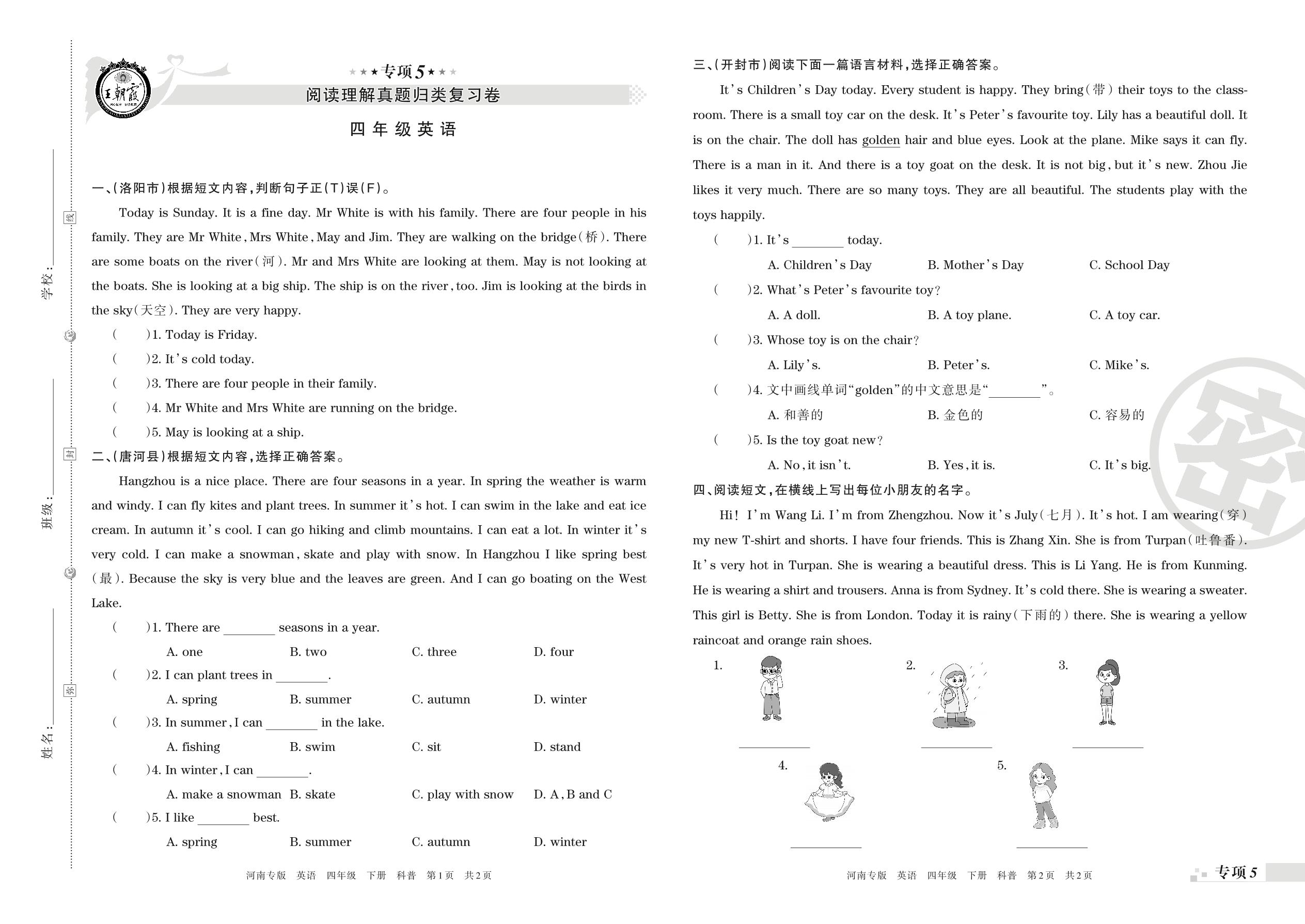 王朝霞期末专项卷——阅读理解真题归类复习、补全短文四年级下册英语(科普版)【0】