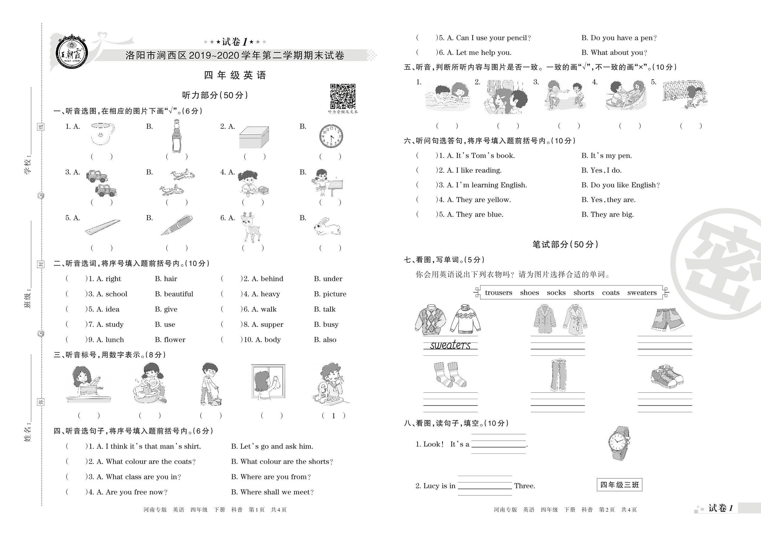 2019-2020学年第二学期洛阳市涧西区四年级英语试卷(科普版)_R21080784412【1】