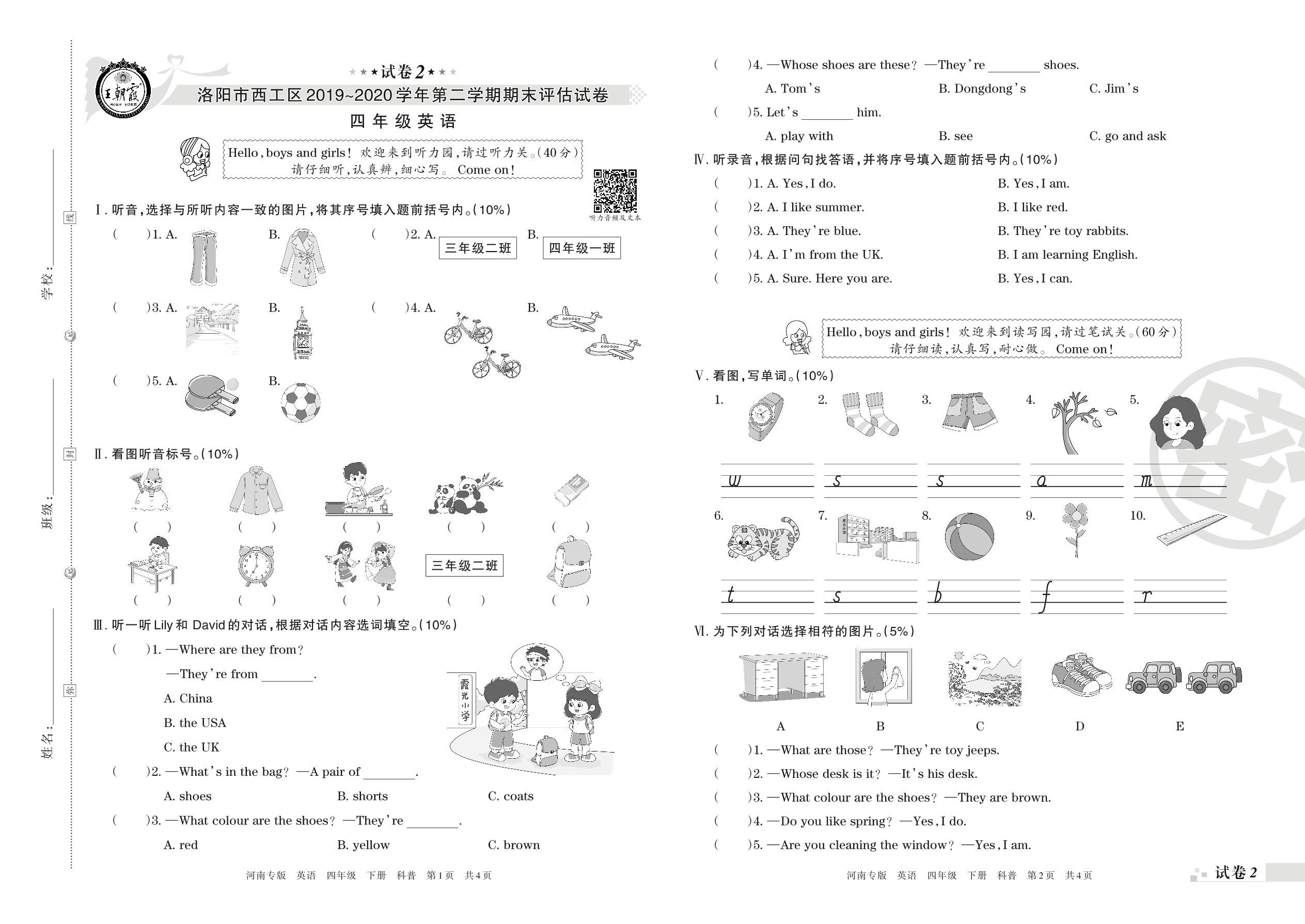 2019-2020学年第二学期洛阳市西工区四年级英语试卷(科普版)【2】
