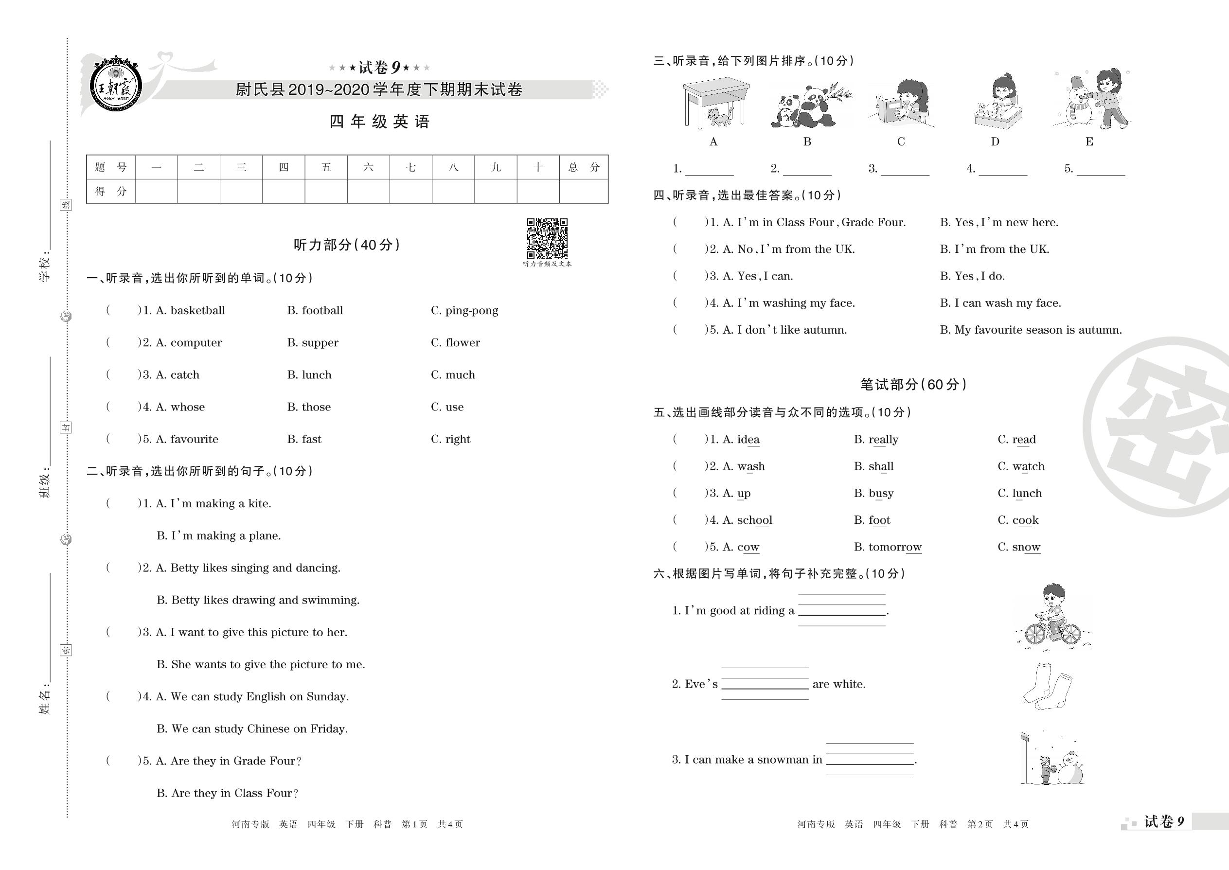 2019-2020学年第二学期开封市尉氏县四年级英语试卷(科普版)【9】
