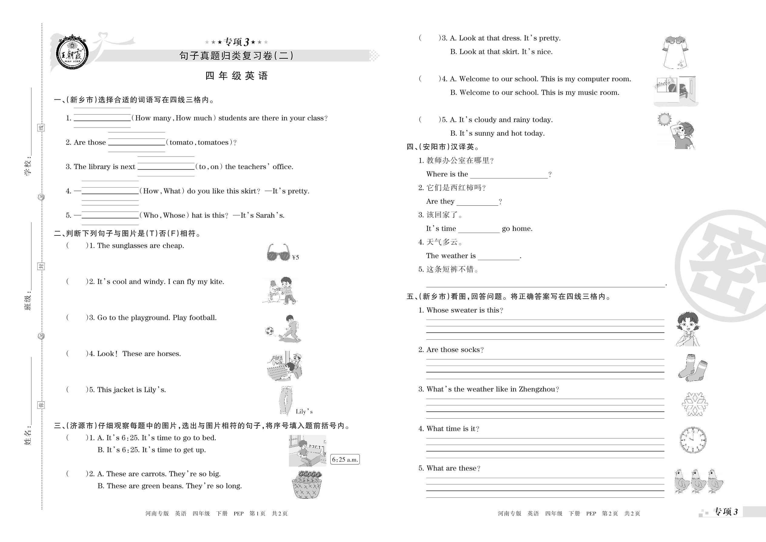 王朝霞期末专项卷——句子、情景交际真题归类复习四年级下册英语(PEP版)【0】